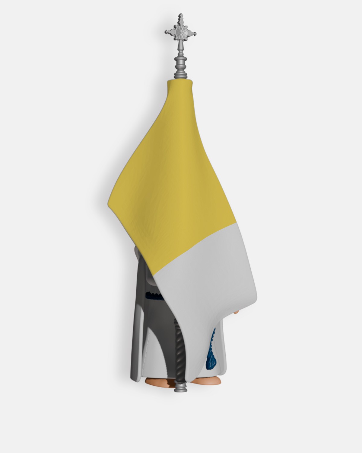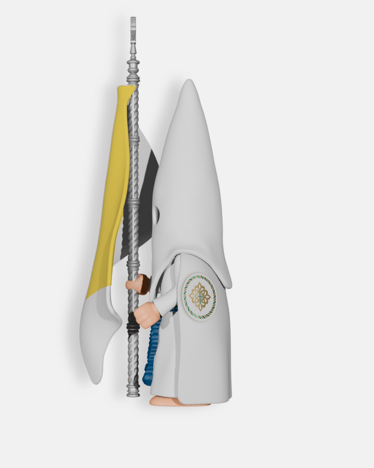 El Nazareno Blanco Bandera Pontificia B1005 de Artabán Juguetes reproduce un nazareno con túnica, capa y antifaz blancos y cíngulo azul, sosteniendo la Bandera Pontificia, inspirado en los desfiles procesionales de Semana Santa. La Bandera Pontificia se utiliza para marcar el comienzo de un nuevo tramo en la procesión y representa el poder espiritual del Papa, con los colores blanco y amarillo simbolizando las llaves de San Pedro.