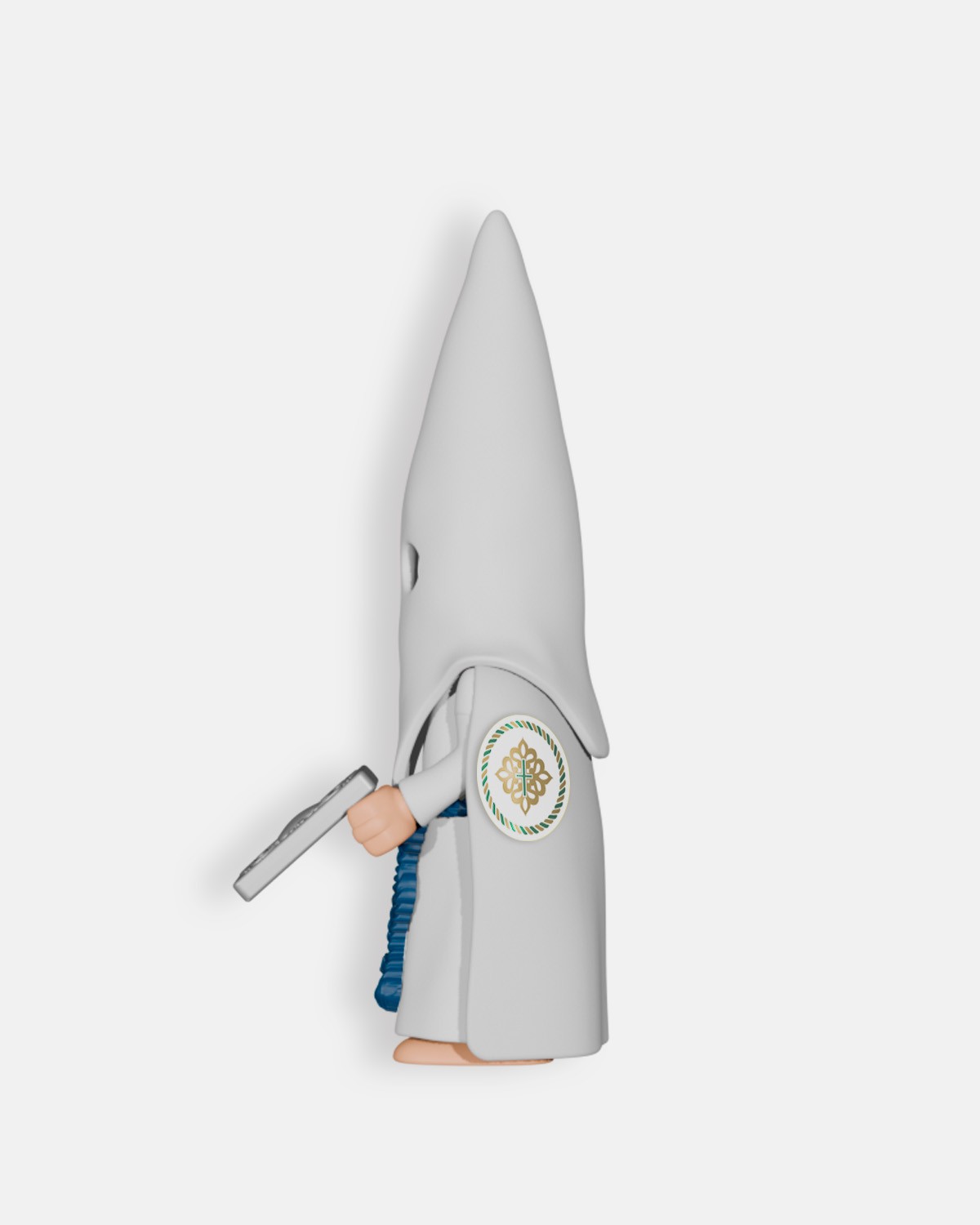 La combinación de túnica, capa y antifaz blancos con cíngulo azul refleja la identidad de la hermandad y aporta un detalle distintivo dentro del cortejo. Cada detalle del muñeco, desde la postura hasta la forma de las manos y pies, respeta la fisionomía característica de los juguetes de Artabán, combinando fidelidad a la tradición con un diseño robusto y seguro.