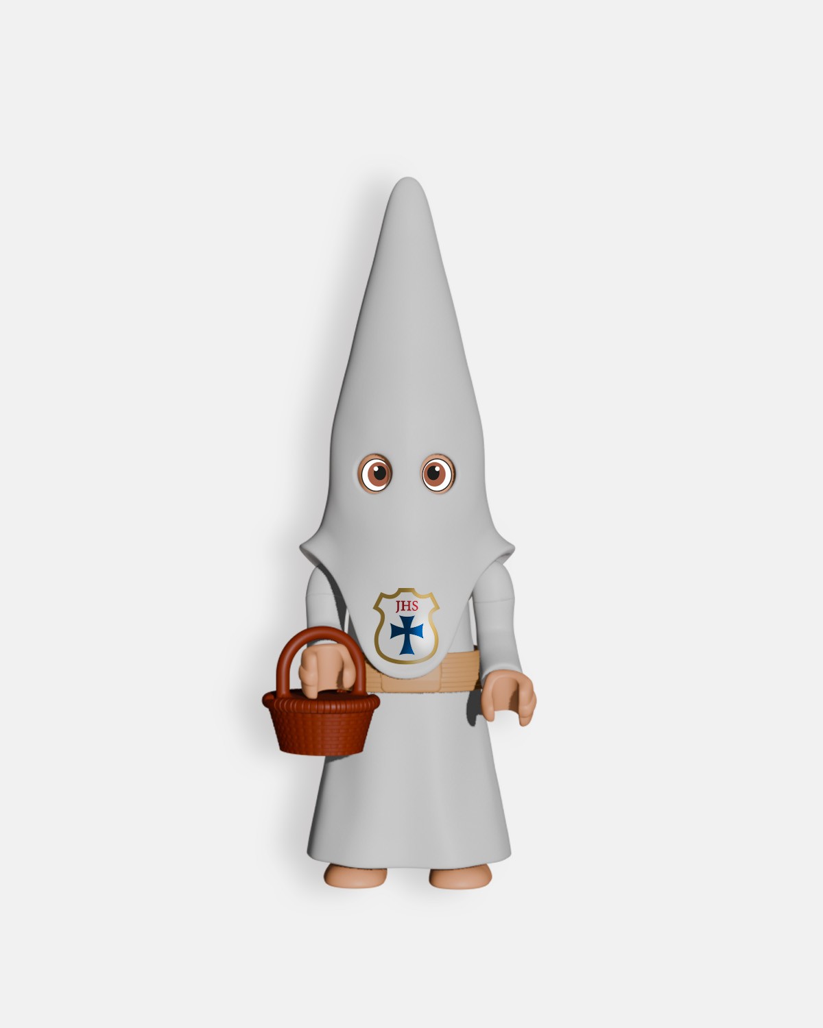 Fabricado con materiales duraderos, este muñeco refleja con precisión los elementos típicos de los nazarenos de cola blanco, incluyendo la túnica de cola blanca, antifaz blanco, cinturón de esparto, y la cesta de mimbre, diseñado para evocar los desfiles procesionales de manera fiel y elegante.