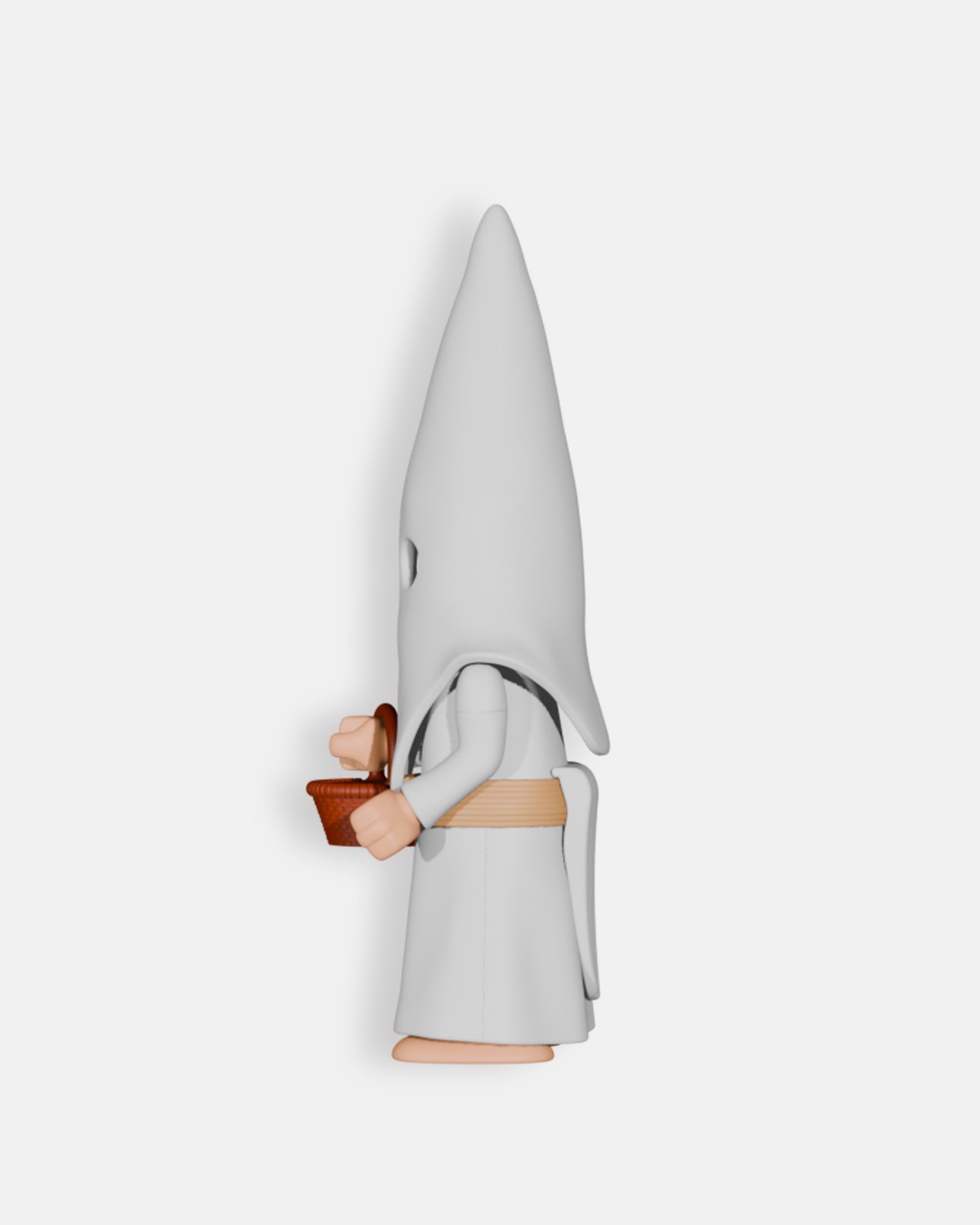 La túnica de cola blanca y el cinturón de esparto distinguen a este modelo de los nazarenos de capa. Cada detalle del muñeco, desde la postura hasta la forma de las manos y pies, respeta la fisionomía característica de los juguetes de Artabán, combinando fidelidad a la tradición con un diseño robusto y seguro.