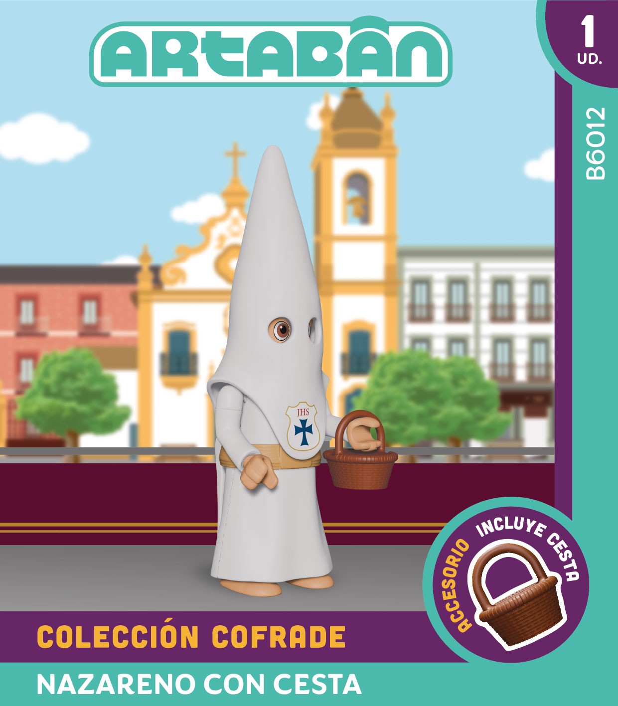 El Nazareno Cola Blanco Cesta B6012 de Artabán Juguetes reproduce un nazareno con túnica de cola blanca, antifaz blanco y cinturón de esparto, sosteniendo una cesta de mimbre, inspirado en los desfiles procesionales de Semana Santa. La cesta es utilizada por los diputados de tramo para portar accesorios necesarios durante la procesión, como el pavilo para encender los cirios, permitiendo mantener la organización y la correcta iluminación de los pasos.