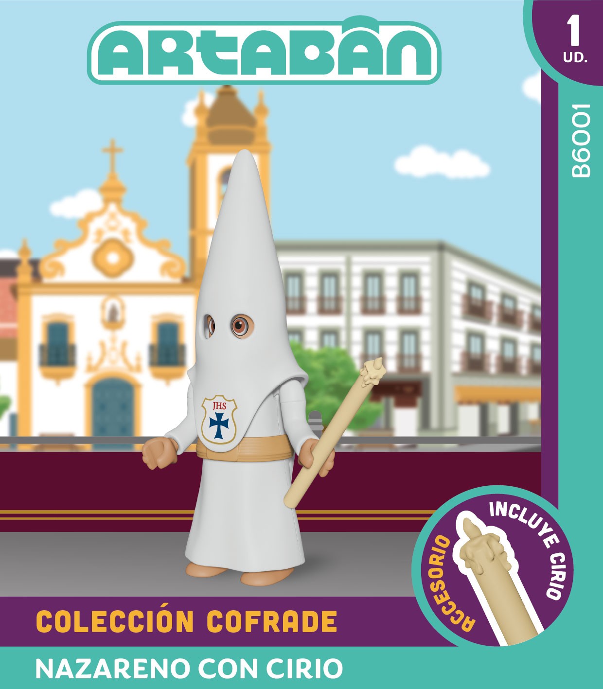 El Nazareno Cola Blanco Cirio B6001 de Artabán Juguetes reproduce un nazareno con túnica de cola blanca, antifaz blanco y cinturón de esparto, sosteniendo un cirio, inspirado en los desfiles procesionales de Semana Santa. La túnica de cola es característica de los nazarenos de este tipo, con la parte trasera más larga, diferenciándose de los modelos con túnica de capa que llevan cíngulo con los colores de la hermandad y capa.