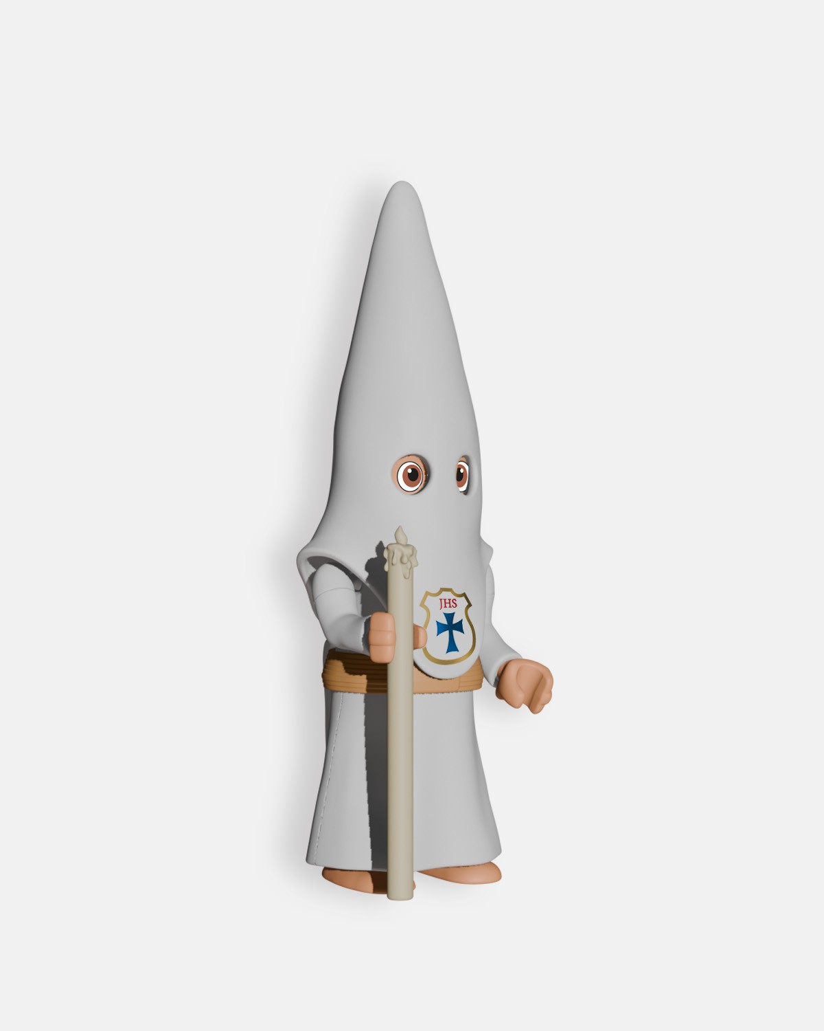 Fabricado con materiales duraderos, este muñeco refleja con precisión los elementos típicos de los nazarenos de cola blanco, incluyendo la túnica de cola y antifaz blancos, el cinturón de esparto, y el cirio, diseñado para evocar los desfiles procesionales de manera fiel y elegante.