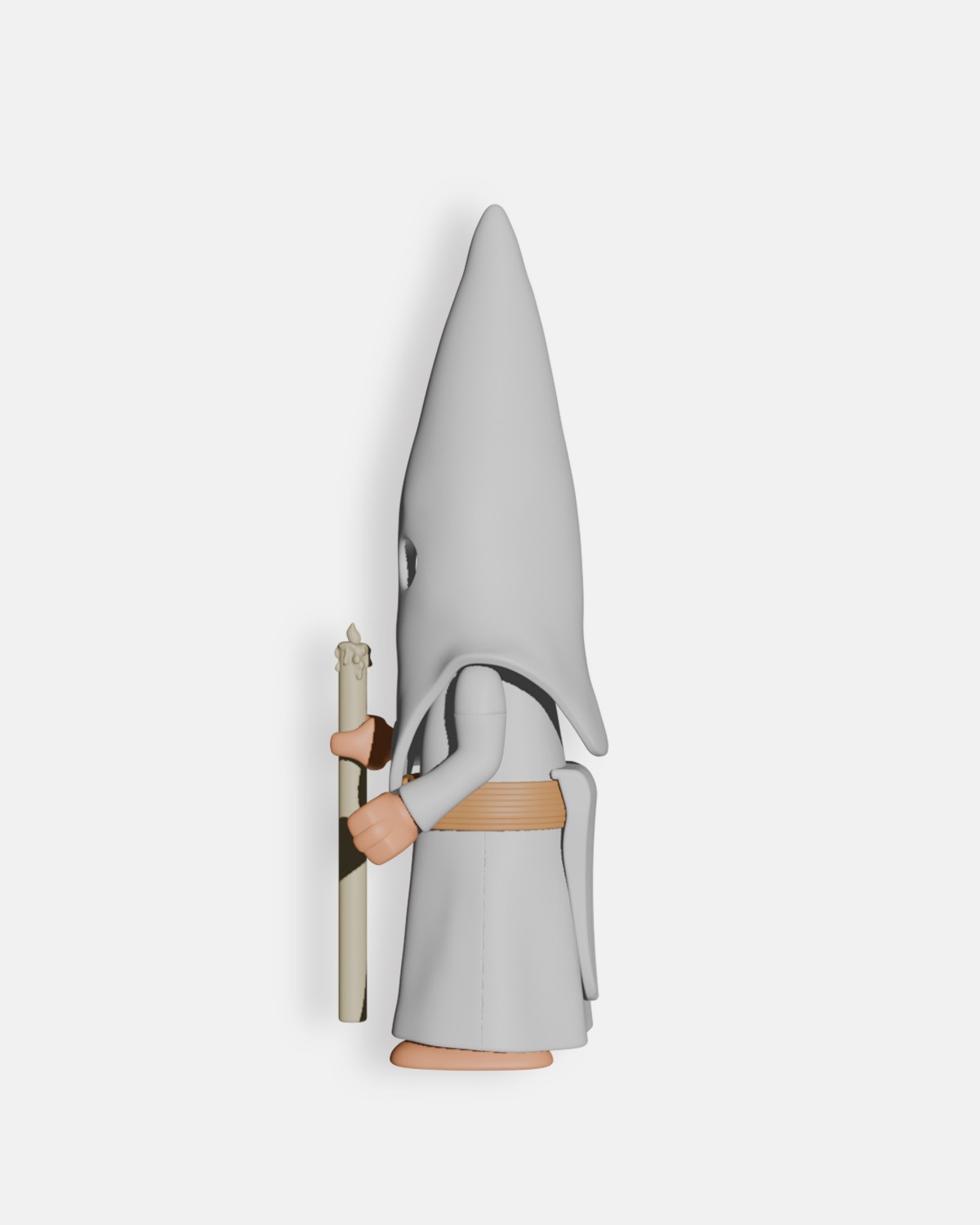 El cirio es un accesorio que representa la luz de la fe y la participación activa del nazareno dentro del desfile. Cada detalle del muñeco, desde la postura hasta la forma de las manos y pies, respeta la fisionomía característica de los juguetes de Artabán, combinando fidelidad a la tradición con un diseño robusto y seguro.