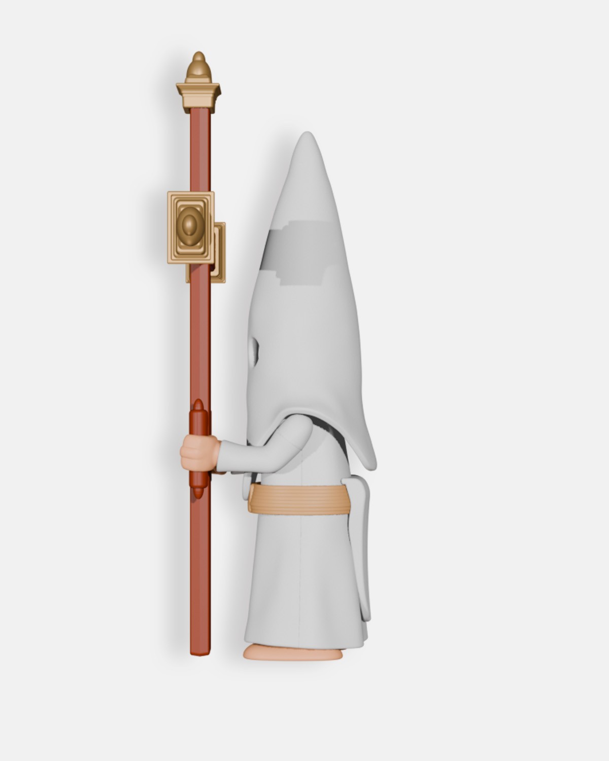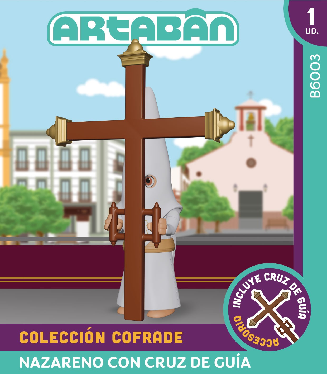 El Nazareno Cola Blanco Cruz de Guía B6003 de Artabán Juguetes representa un nazareno con túnica de cola blanca y cinturón de esparto, portando la cruz de guía, accesorio que marca el inicio del tramo y guía a los nazarenos durante la procesión. Fabricado con materiales resistentes y seguros, mantiene la fisionomía característica de los muñecos de la colección. Este modelo se distingue de los de capa, que llevan cingulo con los colores de la hermandad. Perfecto para aficionados a la Semana Santa, permite conservar un elemento representativo de los pasos y puede exponerse o regalarse.