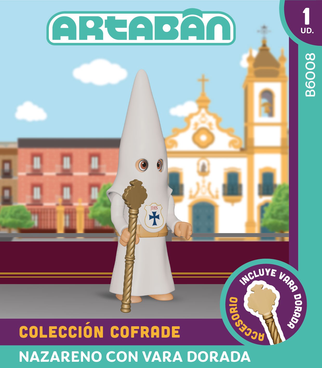 El Nazareno Cola Blanco Vara Larga Dorada B6008 de Artabán Juguetes reproduce un nazareno con túnica de cola blanca, antifaz blanco y cinturón de esparto, sosteniendo la Vara Larga Dorada, inspirado en los desfiles procesionales de Semana Santa. La Vara Larga Dorada es portado por los nazarenos que acompañan las insignias en la separación entre tramos o en la presidencia de los pasos, y sirve para organizar visualmente el cortejo durante la procesión. No se utiliza para golpear el suelo.