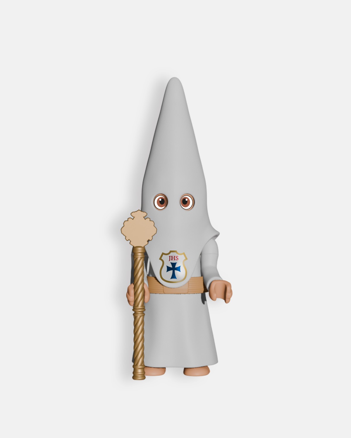 Fabricado con materiales duraderos, este muñeco refleja con precisión los elementos típicos de los nazarenos de cola blanco, incluyendo la túnica de cola blanca, antifaz blanco, cinturón de esparto, y la Vara Larga Dorada, diseñado para evocar los desfiles procesionales de manera fiel y elegante.