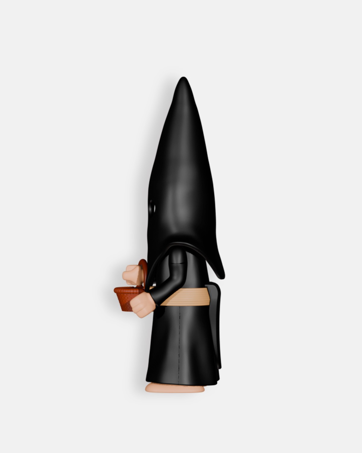 Fabricado con materiales duraderos, este muñeco refleja con precisión los elementos típicos de los nazarenos de cola negro, incluyendo la túnica de cola morada, antifaz negro, cinturón de esparto, y la cesta de mimbre, diseñado para evocar los desfiles procesionales de manera fiel y elegante.