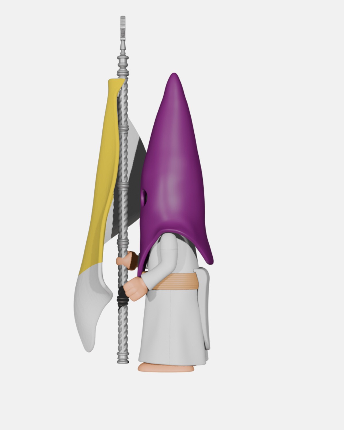 El Nazareno Cola Morado Bandera Pontificia B5005 de Artabán Juguetes reproduce un nazareno con túnica de cola blanca, antifaz morado y cinturón de esparto, sosteniendo la Bandera Pontificia, inspirado en los desfiles procesionales de Semana Santa.