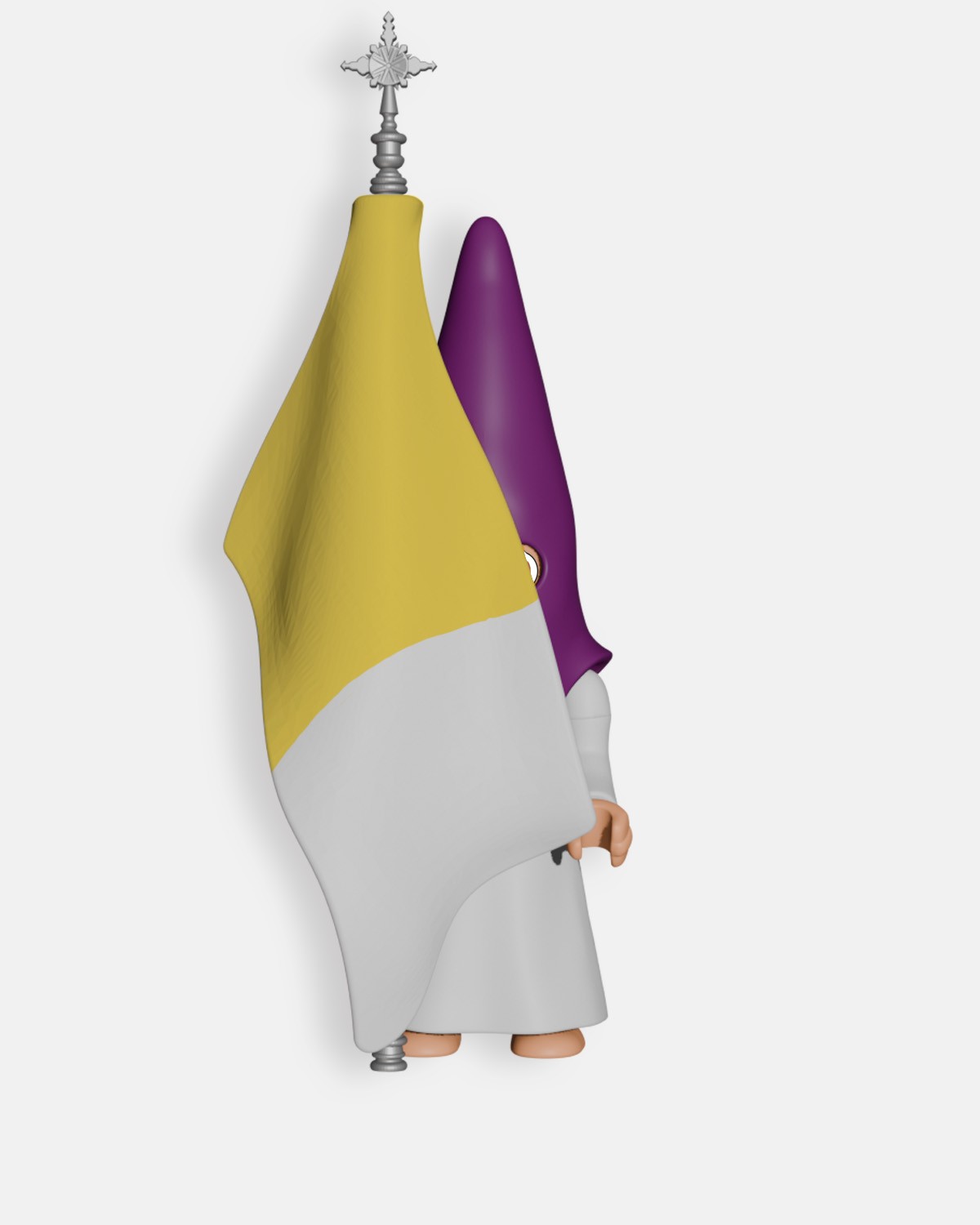 El Nazareno Cola Morado Bandera Pontificia B5005 de Artabán Juguetes representa un nazareno con túnica de cola blanca, antifaz morado y cinturón de esparto, portando la Bandera Pontificia, que se utiliza para marcar el comienzo de un nuevo tramo en la procesión y simboliza el poder espiritual del Papa con los colores blanco y amarillo. Al ser un nazareno de cola, no lleva capa ni cíngulo. Fabricado con materiales resistentes y seguros, mantiene la fisionomía característica de los muñecos de la colección. Perfecto para aficionados a la Semana Santa, permite conservar un elemento representativo de los pasos y puede exponerse o regalarse.