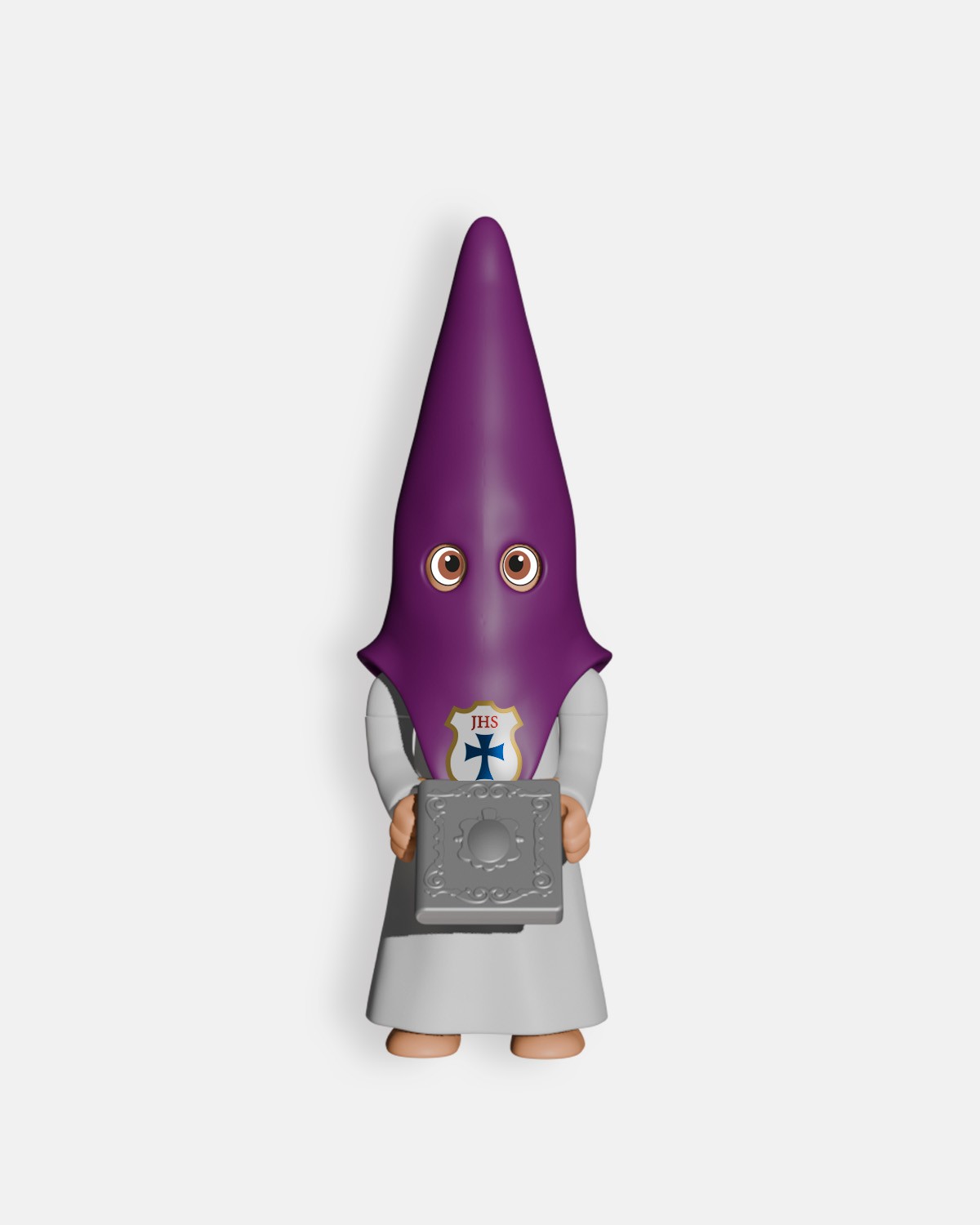 Fabricado con materiales duraderos, este muñeco refleja con precisión los elementos típicos de los nazarenos de cola morado, incluyendo la túnica de cola blanca, antifaz morado, cinturón de esparto, y el Libro de Reglas, diseñado para evocar los desfiles procesionales de manera fiel y elegante.