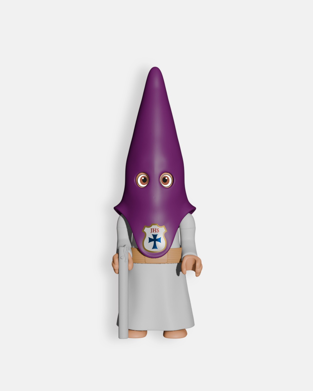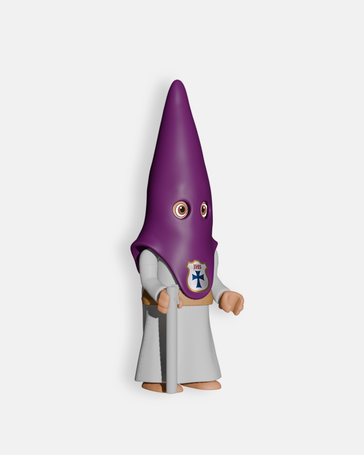 El Nazareno Cola Morado Palermo B5002 de Artabán Juguetes reproduce una figura de nazareno de cola con túnica de cola blanca, antifaz morado y cinturón de esparto, portando el Palermo, accesorio distintivo utilizado para controlar la marcha del resto de nazarenos durante los desfiles procesionales de Semana Santa.