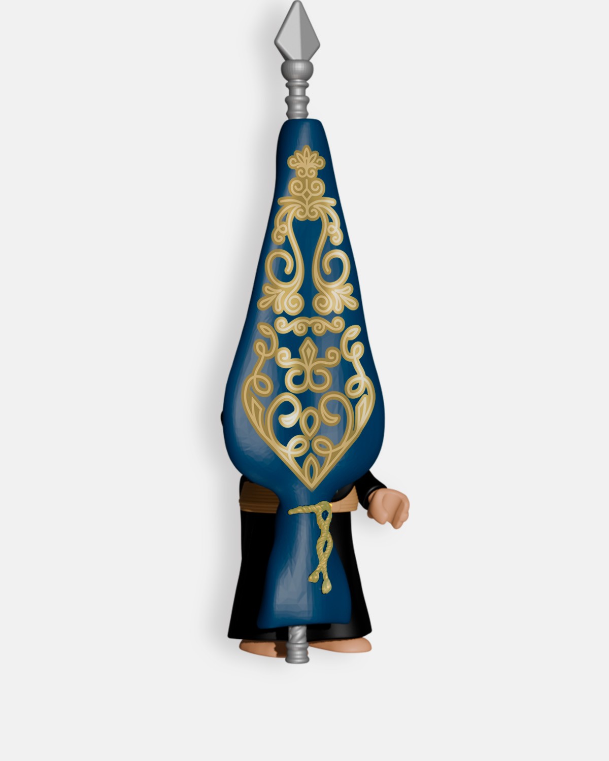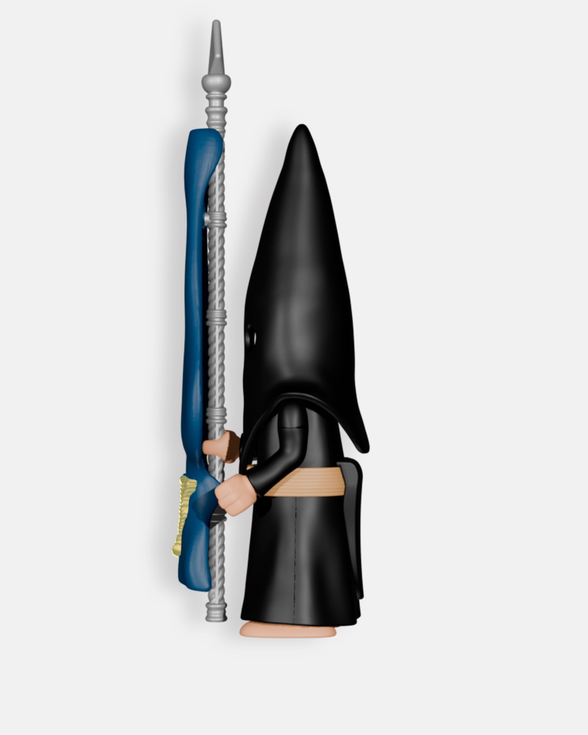 El Nazareno Cola Negro Bacalao B4011 de Artabán Juguetes reproduce un nazareno con túnica de cola negra, capirote alto y cinturón de esparto, sosteniendo el bacalao o estandarte de la hermandad, inspirado en los desfiles procesionales de Semana Santa. La túnica de cola es característica de ciertos nazarenos, con la parte trasera más larga, diferenciándose de los modelos con túnica de capa, que llevan un cíngulo con los colores de la hermandad.