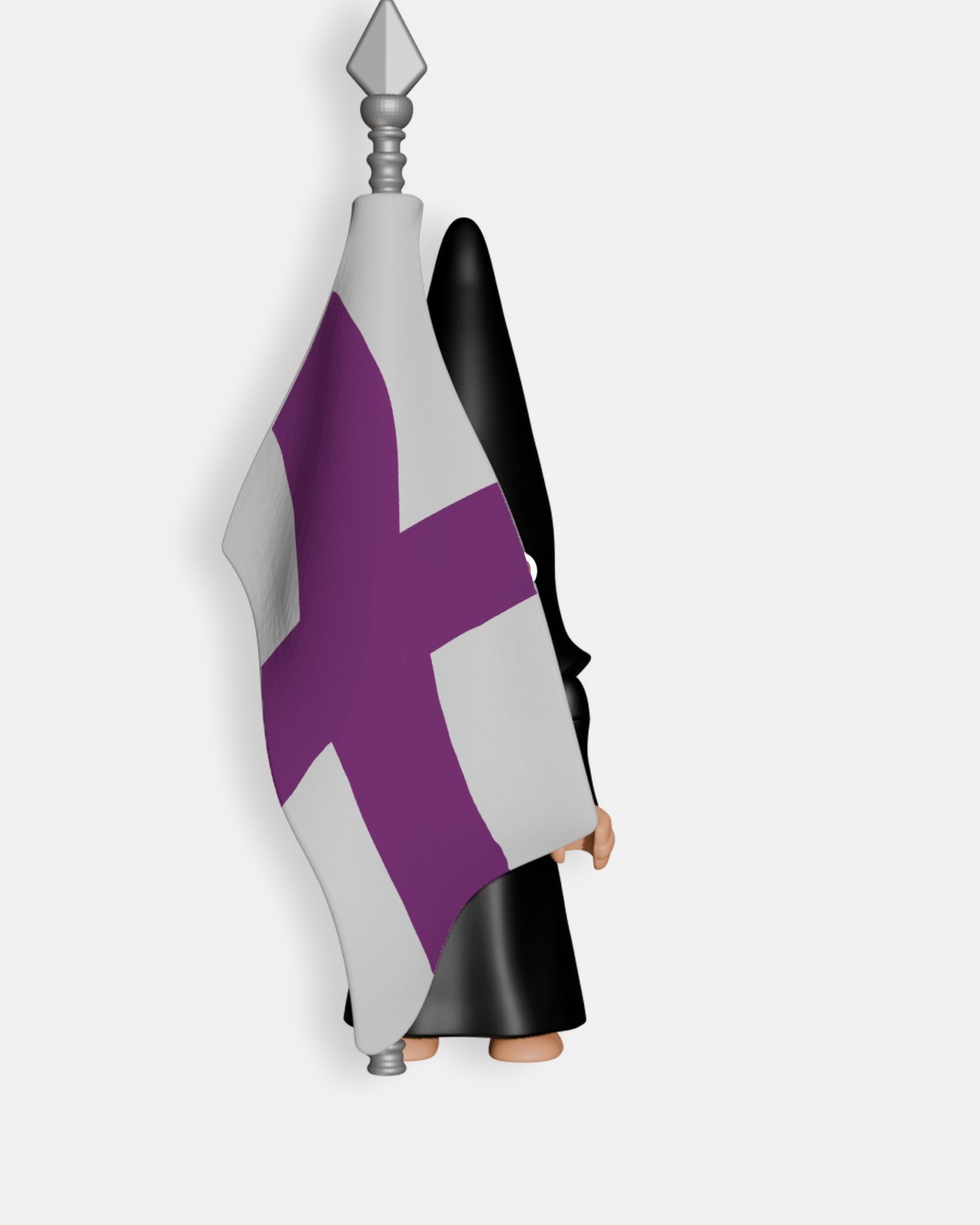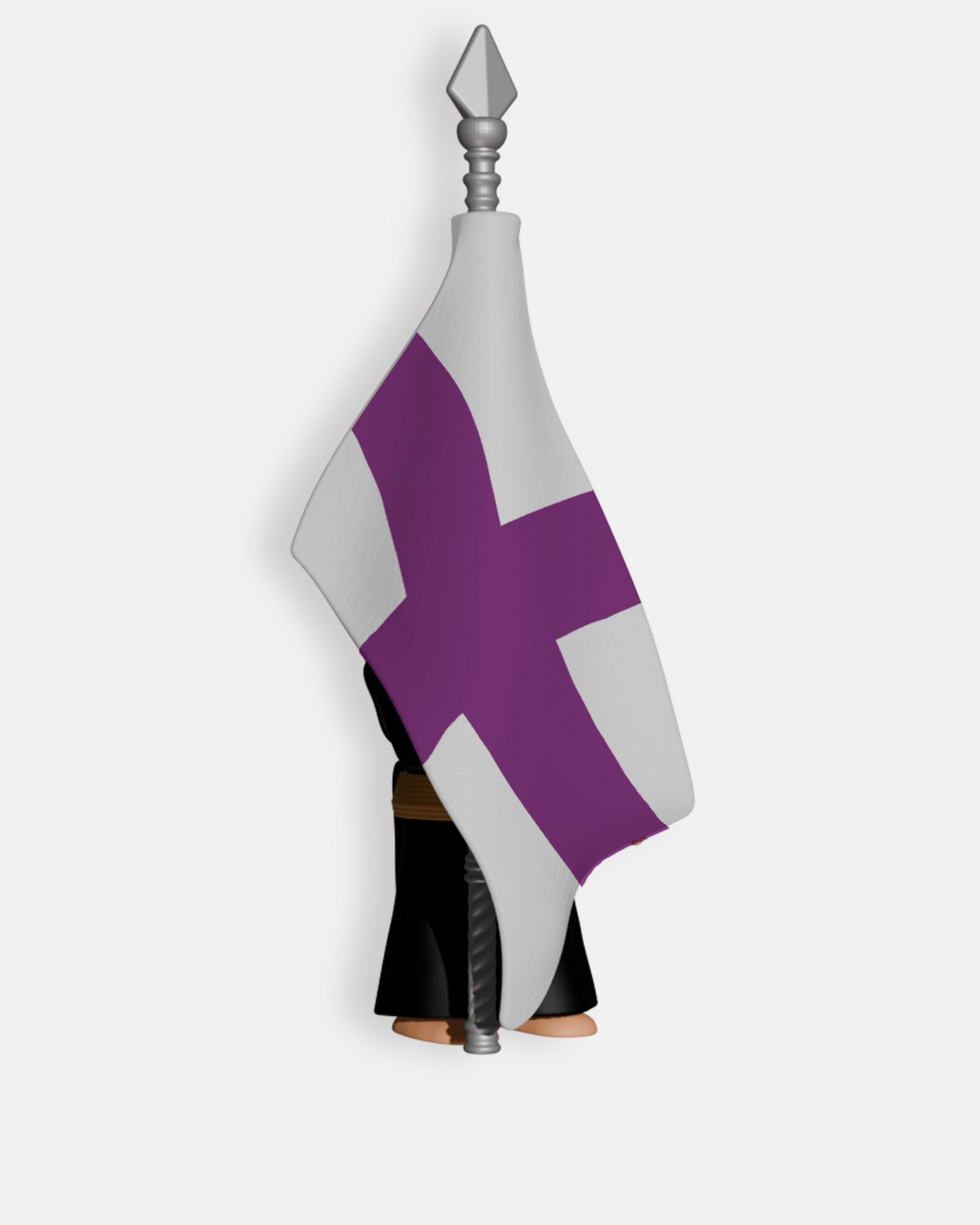 El Nazareno Cola Negro Bandera de Hermandad B4010 de Artabán Juguetes reproduce un nazareno con túnica de cola morada, antifaz negro y cinturón de esparto, sosteniendo la Bandera de Hermandad, inspirado en los desfiles procesionales de Semana Santa. La Bandera de Hermandad representa los colores de la corporación y se utiliza habitualmente para separar los últimos tramos del cortejo, aportando un elemento visual distintivo y respetando la tradición cofrade.
