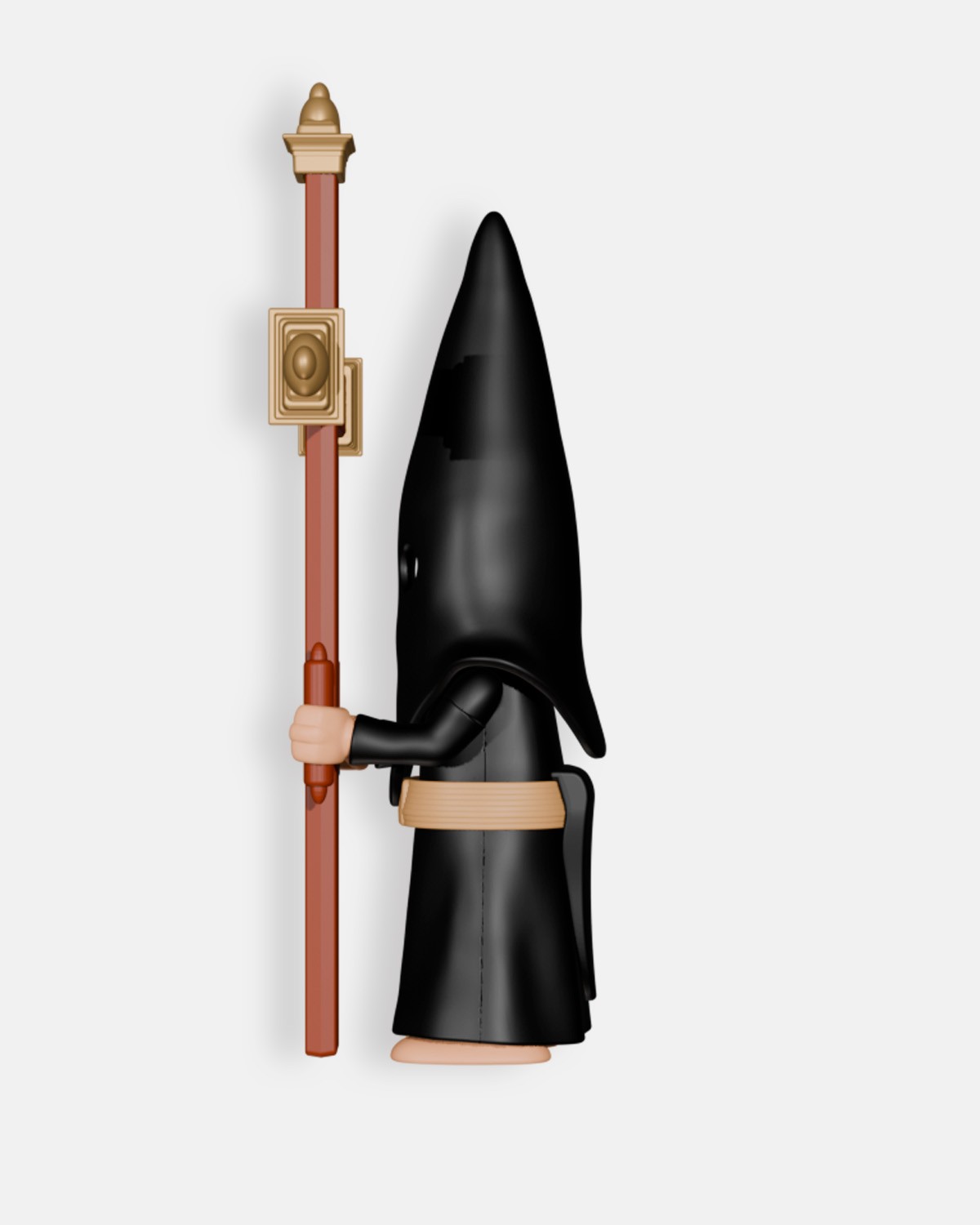 Fabricado con materiales duraderos, este muñeco refleja con precisión los elementos típicos de los nazarenos de cola, incluyendo la túnica de cola, el capirote, el cinturón de esparto y la cruz de guía, diseñado para evocar los desfiles procesionales de manera fiel y elegante.