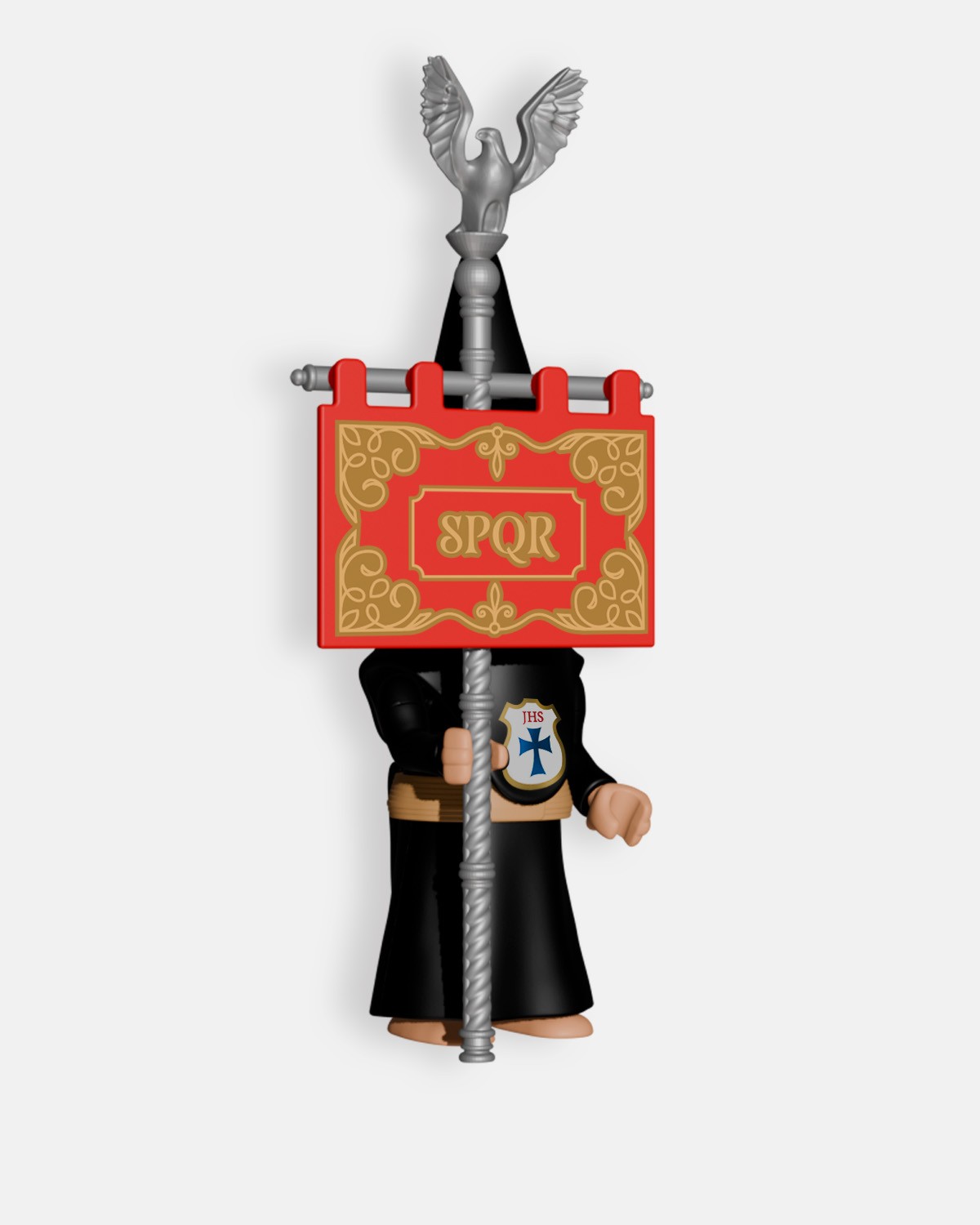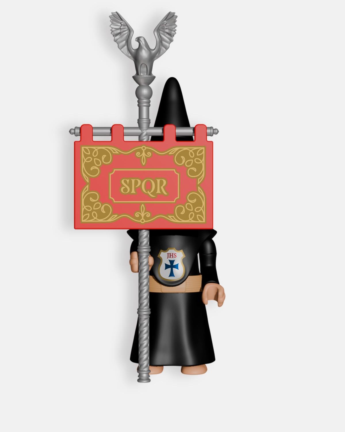 El senatus es una insignia con las siglas SPQR (Senatus Populusque Romanus) que representa “El Senado y el Pueblo Romano”. Este accesorio se utiliza para marcar el comienzo del segundo tramo de la procesión, guiando a los nazarenos y asegurando la correcta organización del desfile. Cada detalle del muñeco, desde la postura hasta la forma de las manos y pies, respeta la fisionomía característica de los juguetes de Artabán, combinando fidelidad a la tradición con un diseño robusto y seguro.