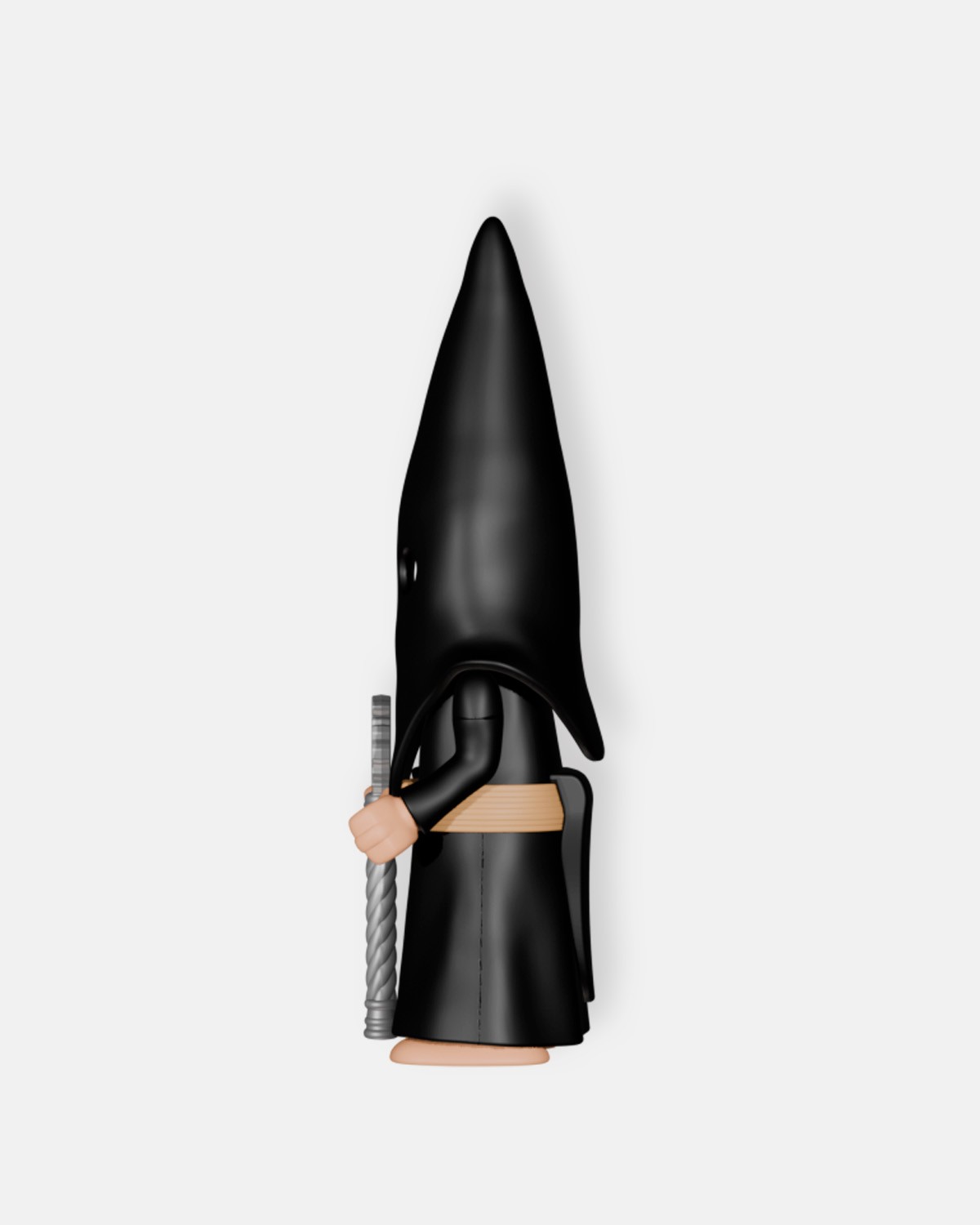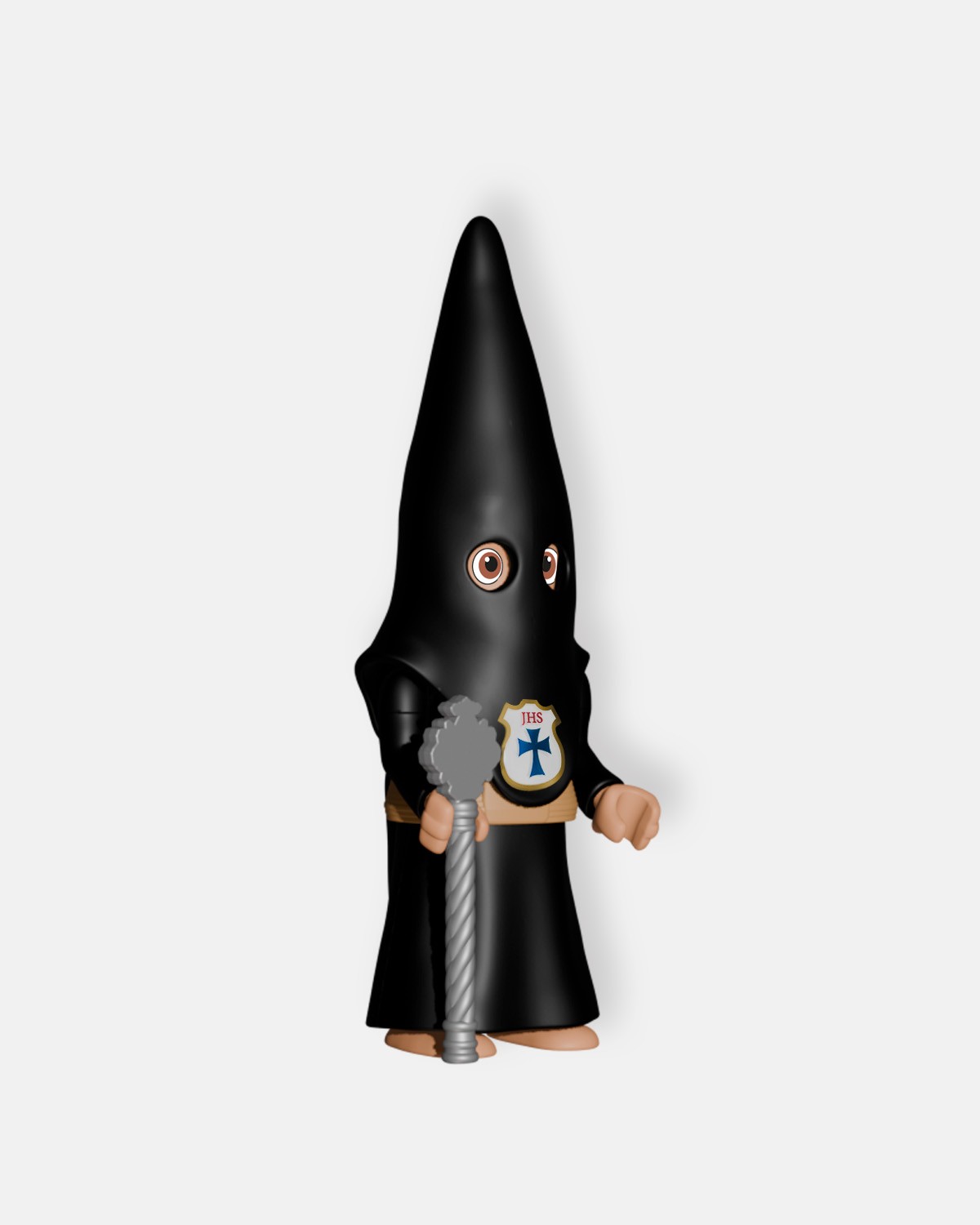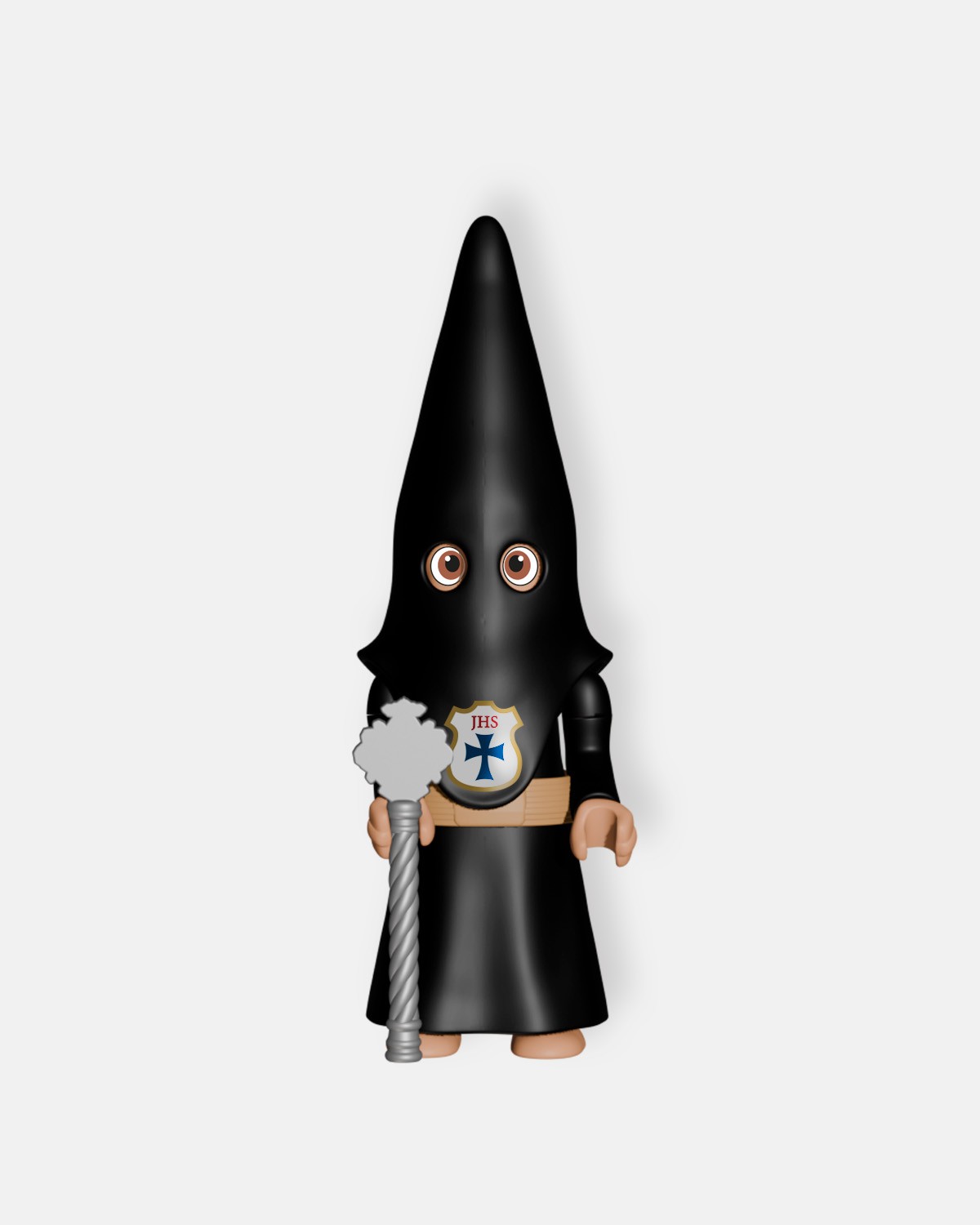 Fabricado con materiales duraderos, este muñeco refleja con precisión los elementos típicos de los nazarenos de cola negro, incluyendo la túnica de cola morada, antifaz negro, cinturón de esparto, y la Vara Corta, diseñado para evocar los desfiles procesionales de manera fiel y elegante.