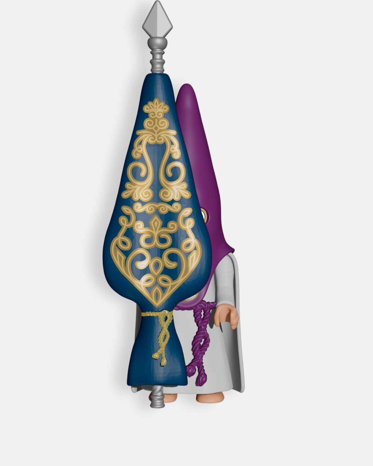 El Nazareno Morado Bacalao B2011 de Artabán Juguetes reproduce un nazareno con túnica y capa blancas, antifaz y cíngulo morados, sosteniendo el Bacalao, inspirado en los desfiles procesionales de Semana Santa. El Bacalao representa el estandarte de la hermandad, siendo la insignia más importante del cortejo, y suele separar el último tramo de la procesión. Se identifica por portar el escudo de la cofradía en el centro, mostrando la identidad de la corporación en la calle.