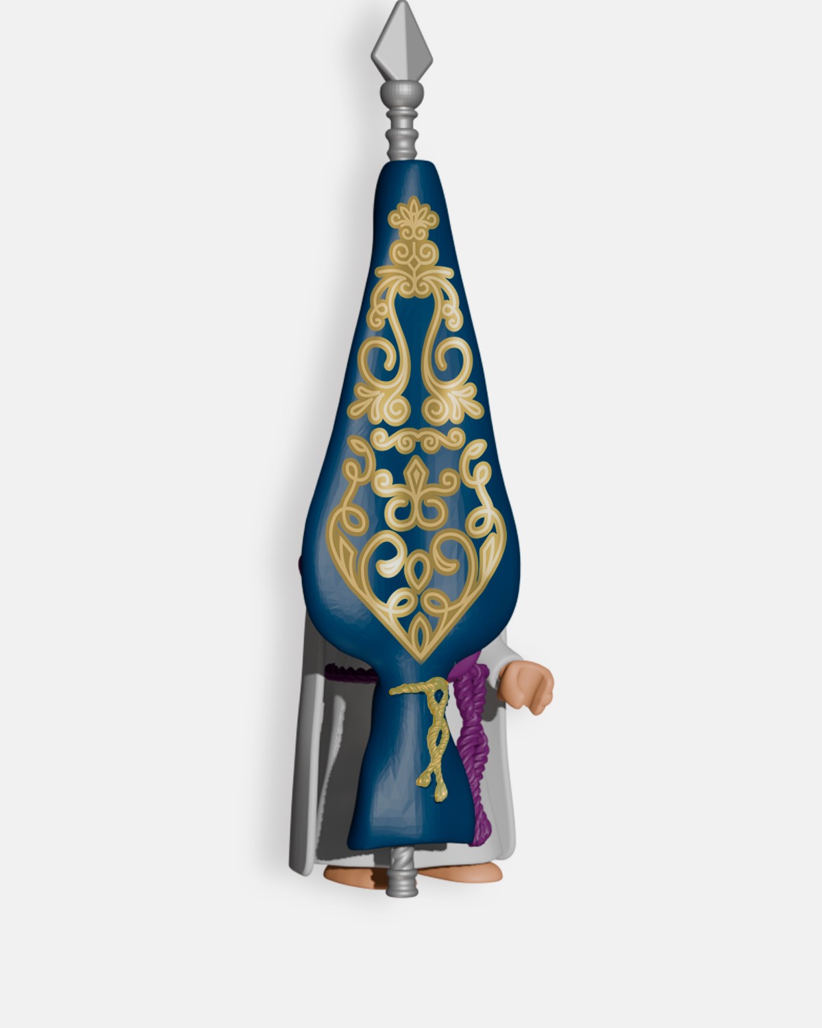 La combinación de túnica y capa blancas con antifaz y cíngulo morados refleja la identidad de la hermandad y aporta un detalle distintivo dentro del cortejo. Cada detalle del muñeco, desde la postura hasta la forma de las manos y pies, respeta la fisionomía característica de los juguetes de Artabán, combinando fidelidad a la tradición con un diseño robusto y seguro.
