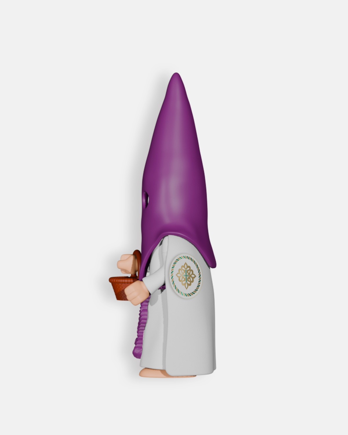 Fabricado con materiales duraderos, este muñeco refleja con precisión los elementos típicos de los nazarenos morados, incluyendo la túnica y capa blancas, antifaz y cíngulo morados, y la cesta de mimbre, diseñado para evocar los desfiles procesionales de manera fiel y elegante.