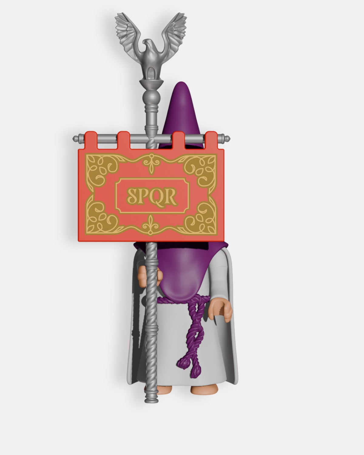 El Nazareno Morado Senatus B2004 de Artabán Juguetes reproduce un nazareno con túnica y capa blancas, antifaz y cíngulo morados, sosteniendo el Senatus, inspirado en los desfiles procesionales de Semana Santa. El Senatus es una insignia que representa las siglas "SPQR" (Senatus Populusque Romanus) y se utiliza para marcar el comienzo del segundo tramo de la procesión, guiando y organizando a los nazarenos en el cortejo.