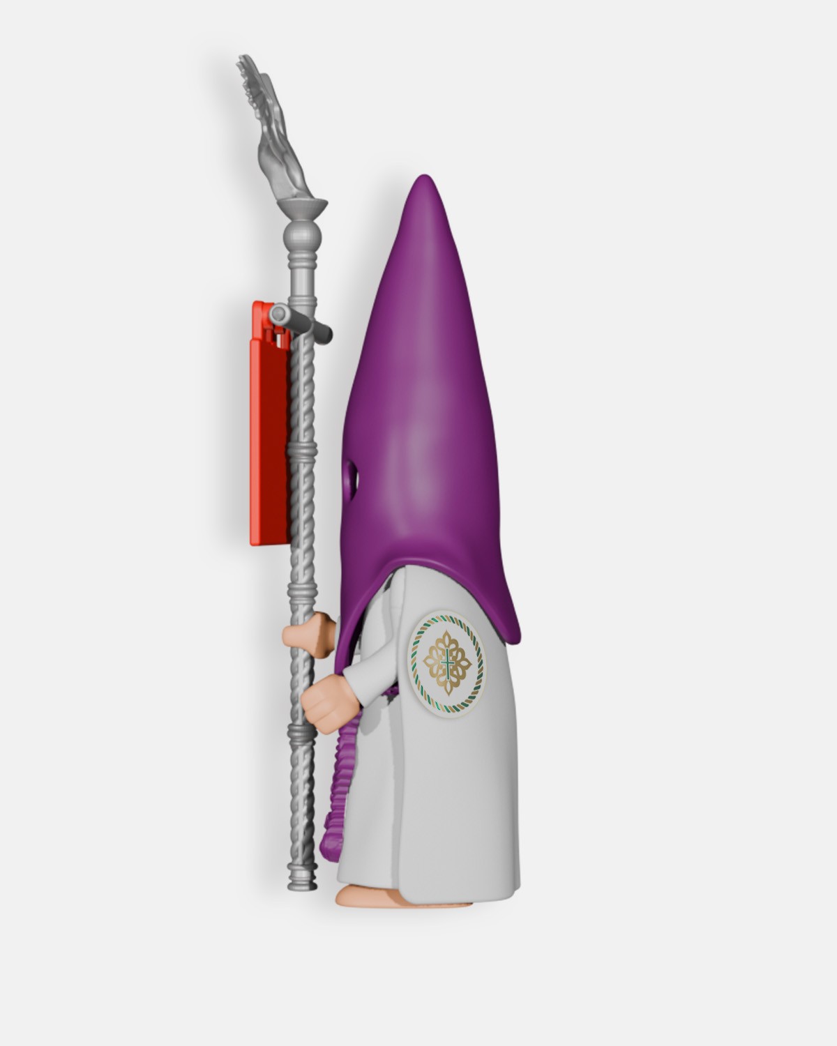 Fabricado con materiales duraderos, este muñeco refleja con precisión los elementos típicos de los nazarenos morados, incluyendo la túnica y capa blancas, antifaz y cíngulo morados, y el Senatus, diseñado para evocar los desfiles procesionales de manera fiel y elegante.