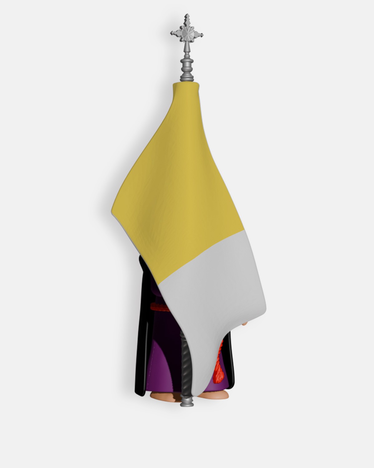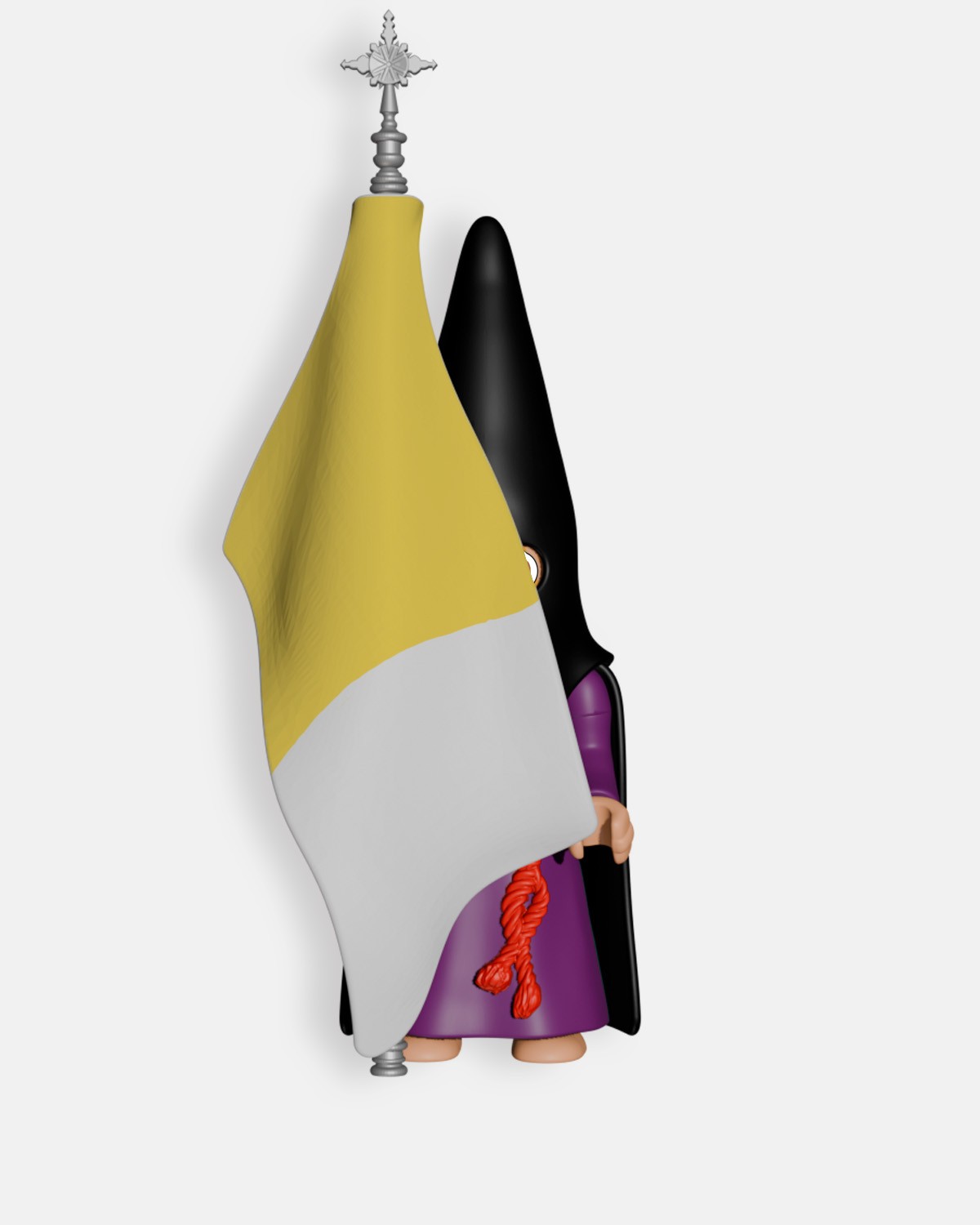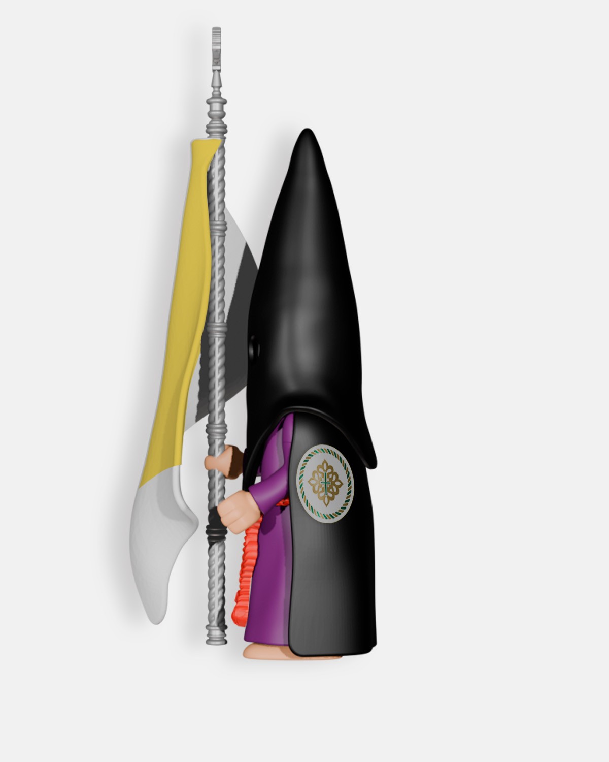 El Nazareno Negro Bandera Pontificia B3005 de Artabán Juguetes reproduce un nazareno con túnica morada, capa negra, antifaz negro y cíngulo rojo, sosteniendo la Bandera Pontificia, inspirado en los desfiles procesionales de Semana Santa. La Bandera Pontificia se utiliza para marcar el comienzo de un nuevo tramo en la procesión y representa el poder espiritual del Papa, con los colores blanco y amarillo simbolizando las llaves de San Pedro.