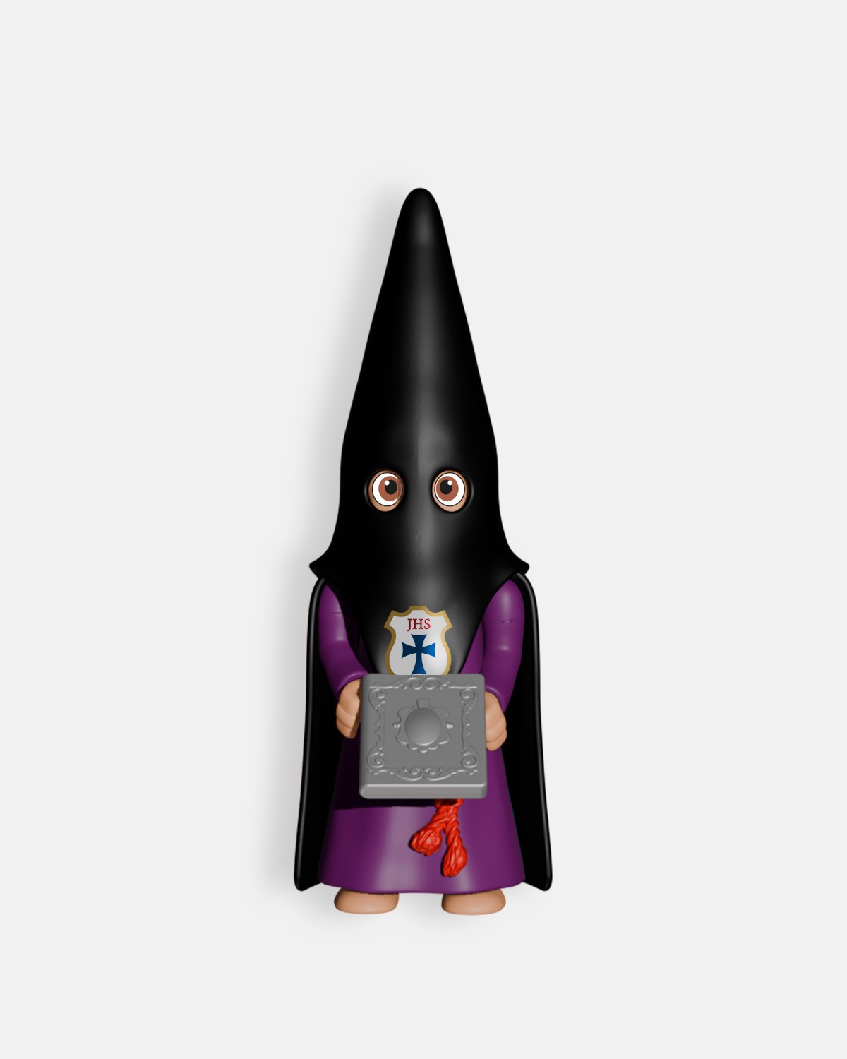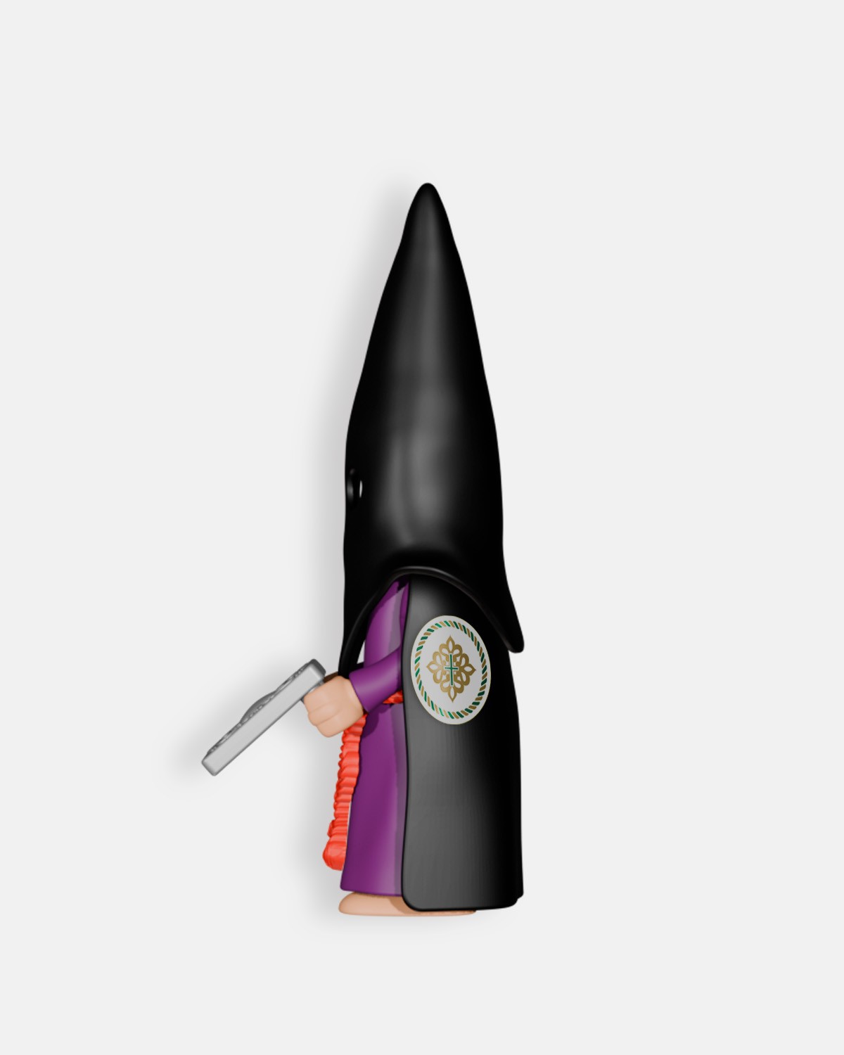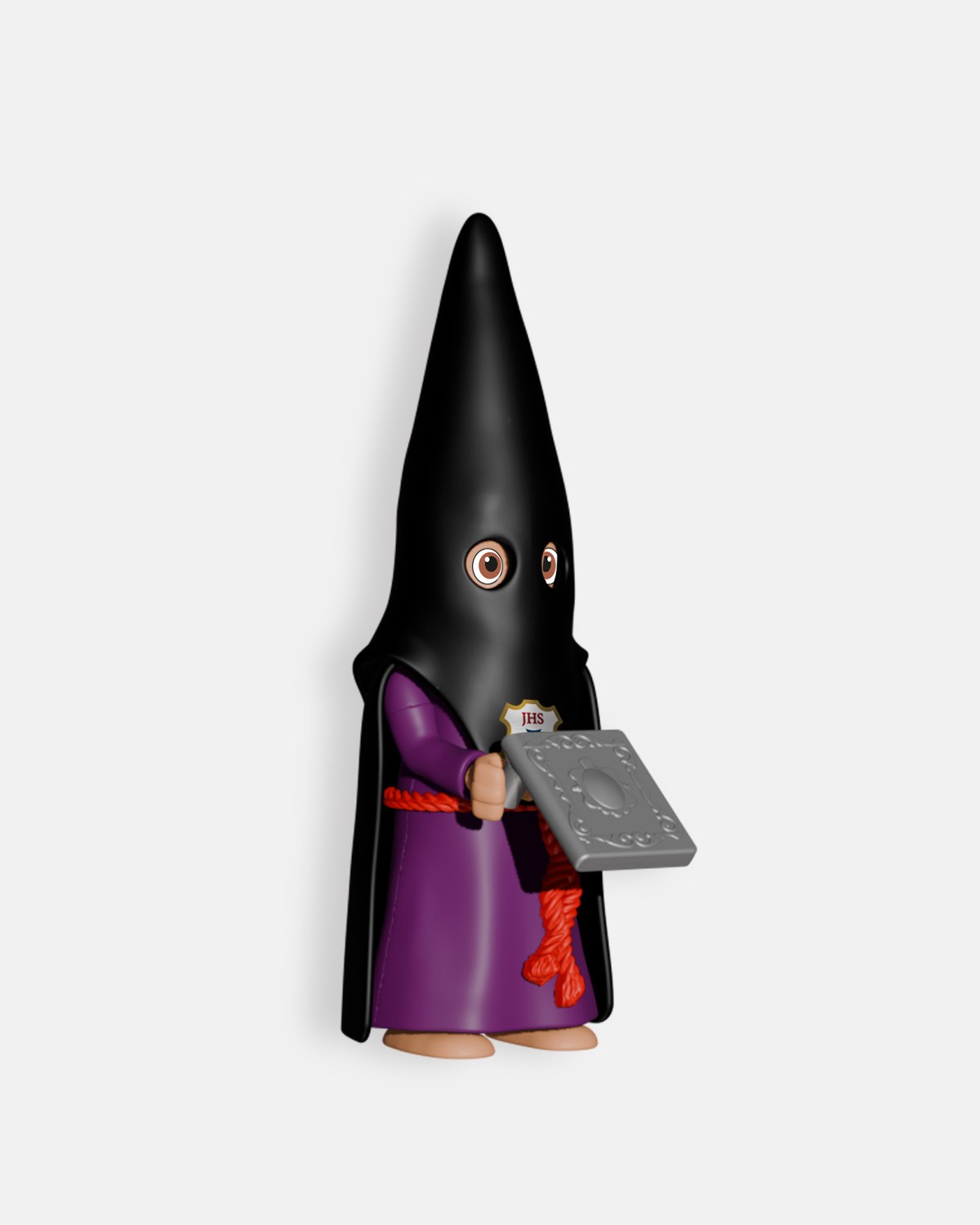 Fabricado con materiales duraderos, este muñeco refleja con precisión los elementos típicos de los nazarenos negros, incluyendo la túnica morada, capa negra, antifaz negro y cíngulo rojo, y el Libro de Reglas, diseñado para evocar los desfiles procesionales de manera fiel y elegante.