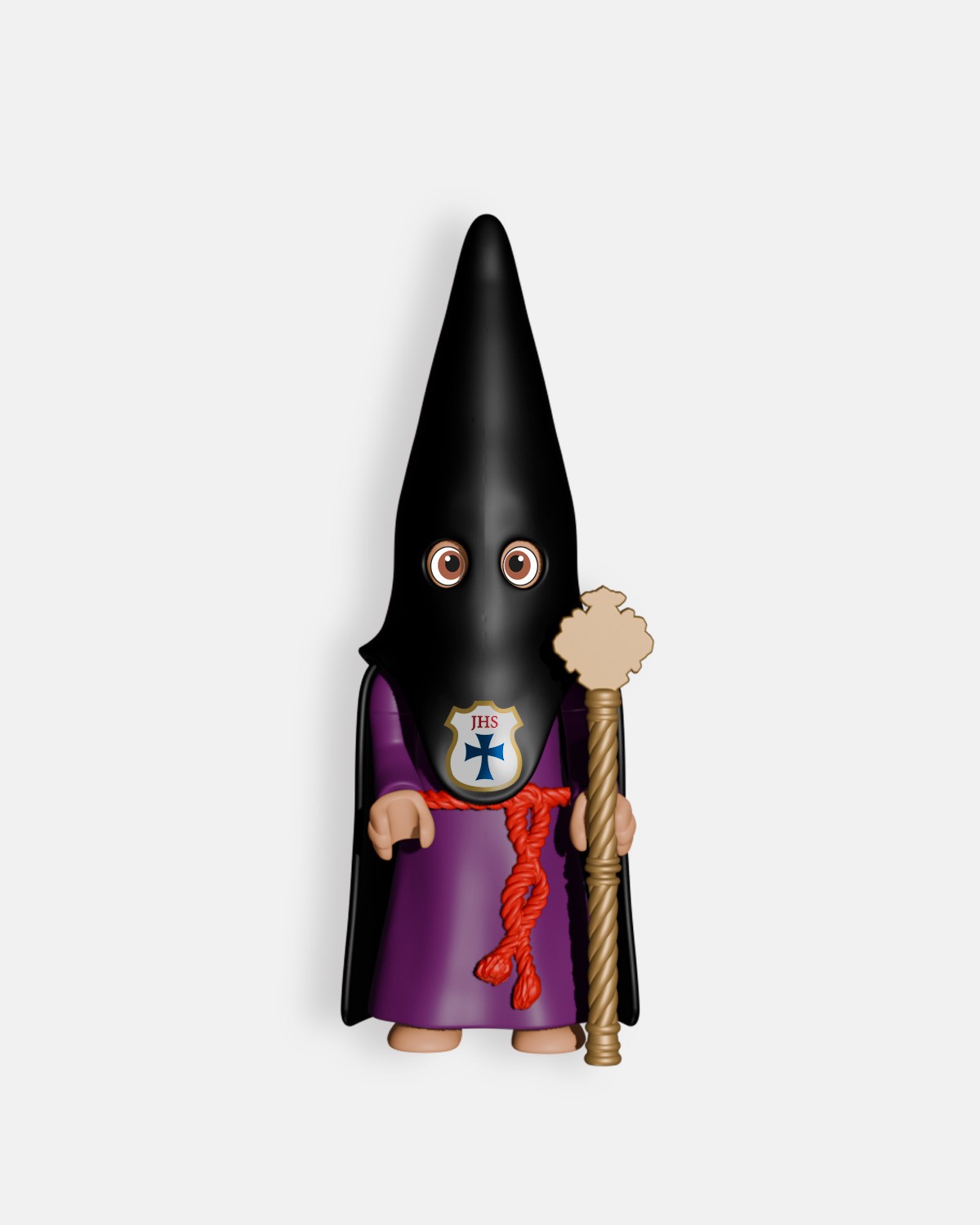 Fabricado con materiales duraderos, este muñeco refleja con precisión los elementos típicos de los nazarenos negros, incluyendo la túnica morada, capa negra, antifaz negro y cíngulo rojo, y la Vara Larga Dorada, diseñado para evocar los desfiles procesionales de manera fiel y elegante.
