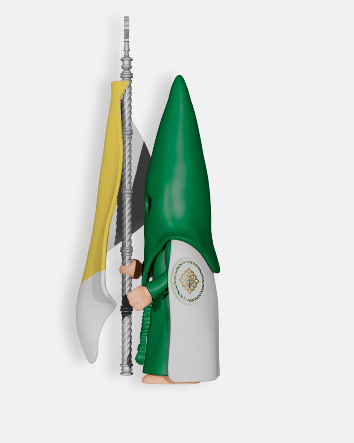 Fabricado con materiales duraderos, este muñeco refleja con precisión los elementos típicos de los nazarenos de capa verde, incluyendo la túnica, antifaz y cíngulo verdes, capa blanca, y la Bandera Pontificia, diseñado para evocar los desfiles procesionales de manera fiel y elegante.