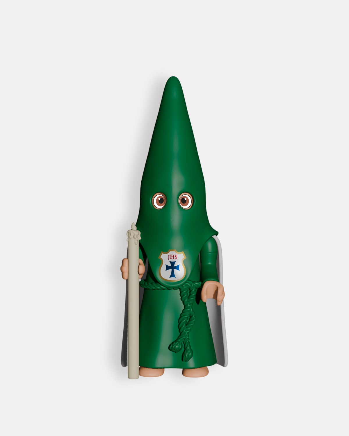 Fabricado con materiales duraderos, este muñeco refleja con precisión los elementos típicos de los nazarenos de capa, incluyendo la túnica, antifaz y cíngulo verdes, la capa blanca, y el cirio, diseñado para evocar los desfiles procesionales de manera fiel y elegante.