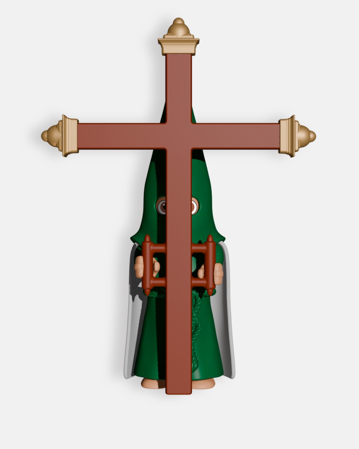 El Nazareno Verde Cruz de Guía B0003 de Artabán Juguetes reproduce un nazareno con túnica, antifaz y cíngulo verdes y capa blanca, sosteniendo la Cruz de Guía, inspirado en los desfiles procesionales de Semana Santa. La Cruz de Guía es uno de los elementos más representativos del cortejo, utilizada para marcar el inicio del trayecto de la procesión y guiar a los nazarenos.