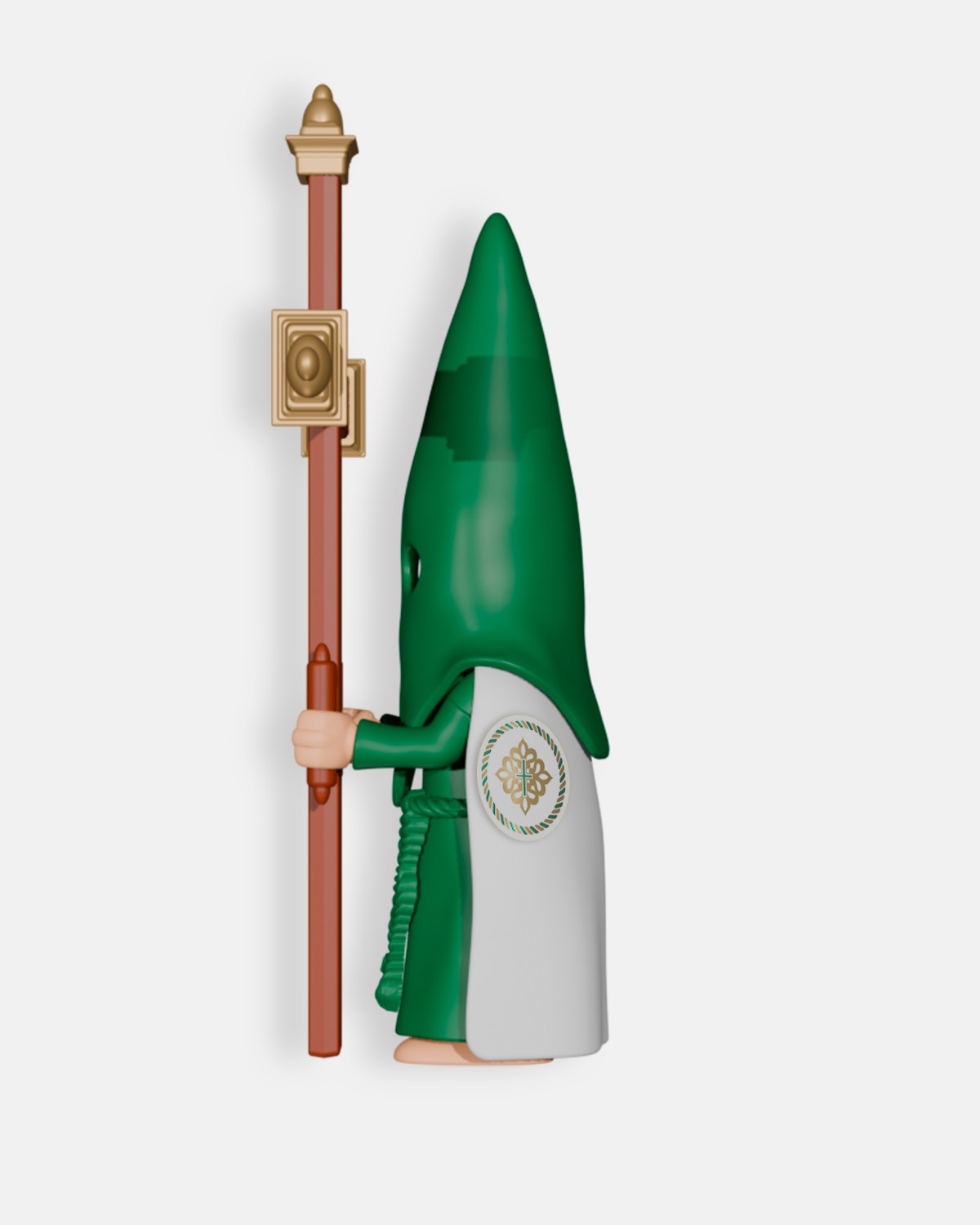 Fabricado con materiales duraderos, este muñeco refleja con precisión los elementos típicos de los nazarenos de capa verde, incluyendo la túnica, antifaz y cíngulo verdes, capa blanca, y la Cruz de Guía, diseñado para evocar los desfiles procesionales de manera fiel y elegante.