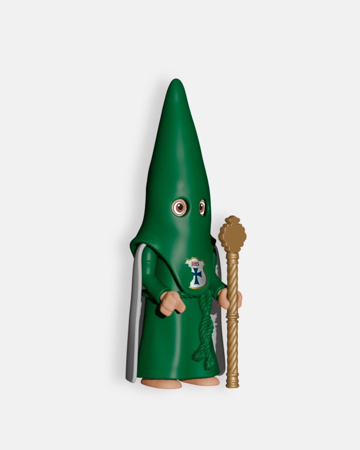 Fabricado con materiales duraderos, este muñeco refleja con precisión los elementos típicos de los nazarenos de capa verde, incluyendo la túnica, antifaz y cíngulo verdes, capa blanca, y la Vara Larga Dorada, diseñado para evocar los desfiles procesionales de manera fiel y elegante.