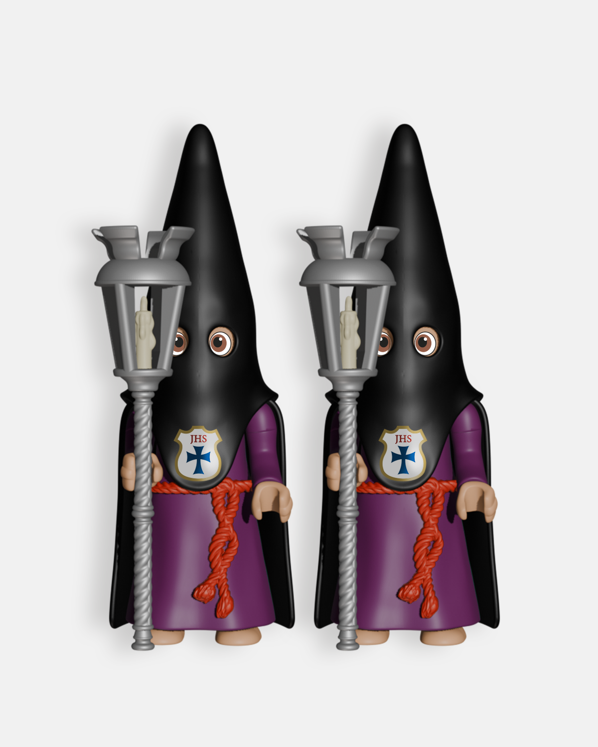 El Pack 2 Nazarenos Negro con Farol P3001 de Artabán Juguetes incluye dos figuras de nazarenos con túnica morada, antifaz negro, capa negra y cíngulo morado, portando faroles de plata con vela en su interior, utilizados en las procesiones de Semana Santa. Fabricadas con materiales resistentes y diseño detallado, estas figuras reproducen fielmente la postura, expresión y vestimenta de los nazarenos, aportando autenticidad y realismo a cualquier colección. Ideal para aficionados y coleccionistas, permite complementar tramos procesionales o recrear escenas de la Semana Santa.