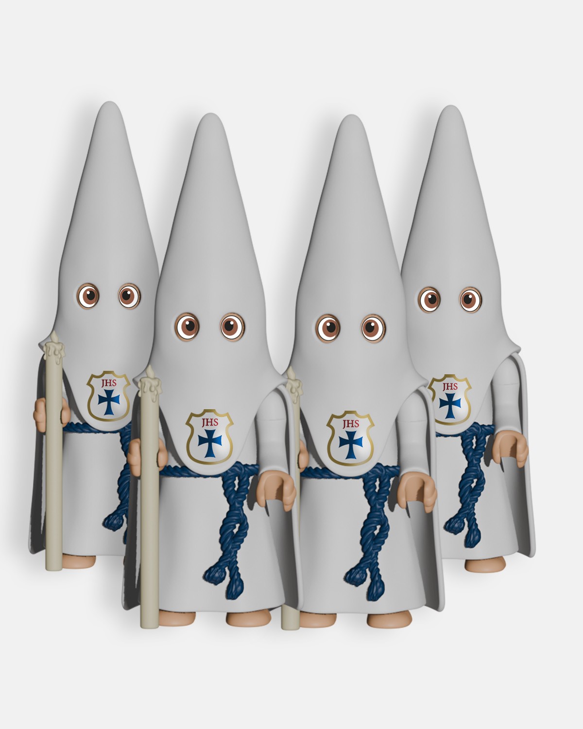 El Pack 4 Nazarenos Blanco Cirio P1002 de Artabán Juguetes incluye cuatro nazarenos con túnica y capa blancas, antifaz blanco y cíngulo azul, portando cada uno un cirio, utilizado durante los desfiles procesionales de Semana Santa para iluminar y marcar el ritmo de la marcha. Al ser nazarenos de capa, no llevan cinturón de esparto. Fabricado con materiales resistentes y seguros, es ideal para coleccionistas y aficionados a la Semana Santa, permitiendo reproducir tramos de procesión de forma realista.