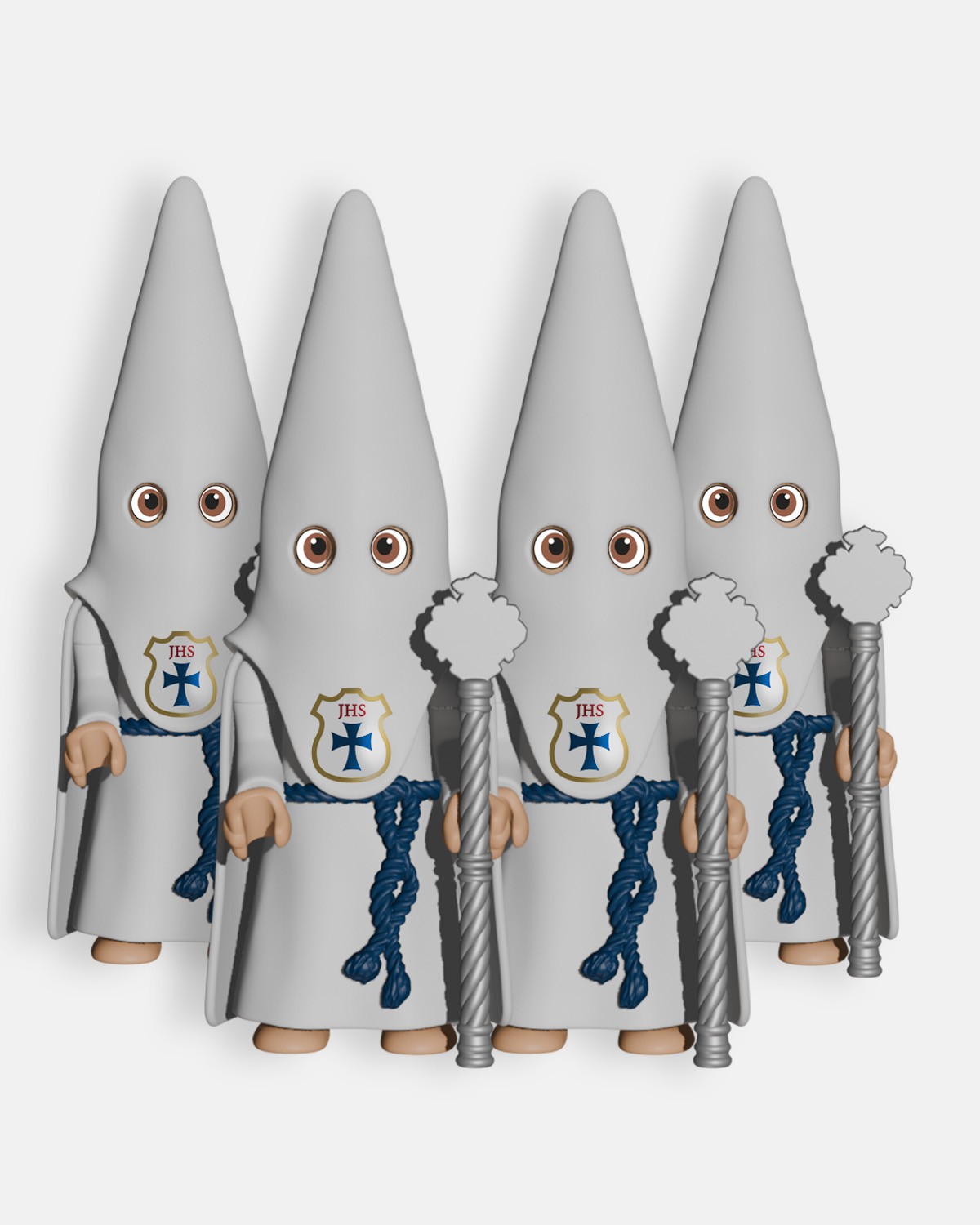 El Pack 4 Nazarenos Blanco Vara Larga Plateada P1003 de Artabán Juguetes incluye cuatro nazarenos con túnica y capa blancas, antifaz blanco y cíngulo azul, portando cada uno una vara larga plateada, utilizada durante los desfiles procesionales de Semana Santa por los nazarenos que acompañan insignias o en la presidencia de los pasos. Al ser nazarenos de capa, no llevan cinturón de esparto. Fabricado con materiales resistentes y seguros, es ideal para coleccionistas y aficionados a la Semana Santa, permitiendo representar tramos completos de la procesión de manera realista.