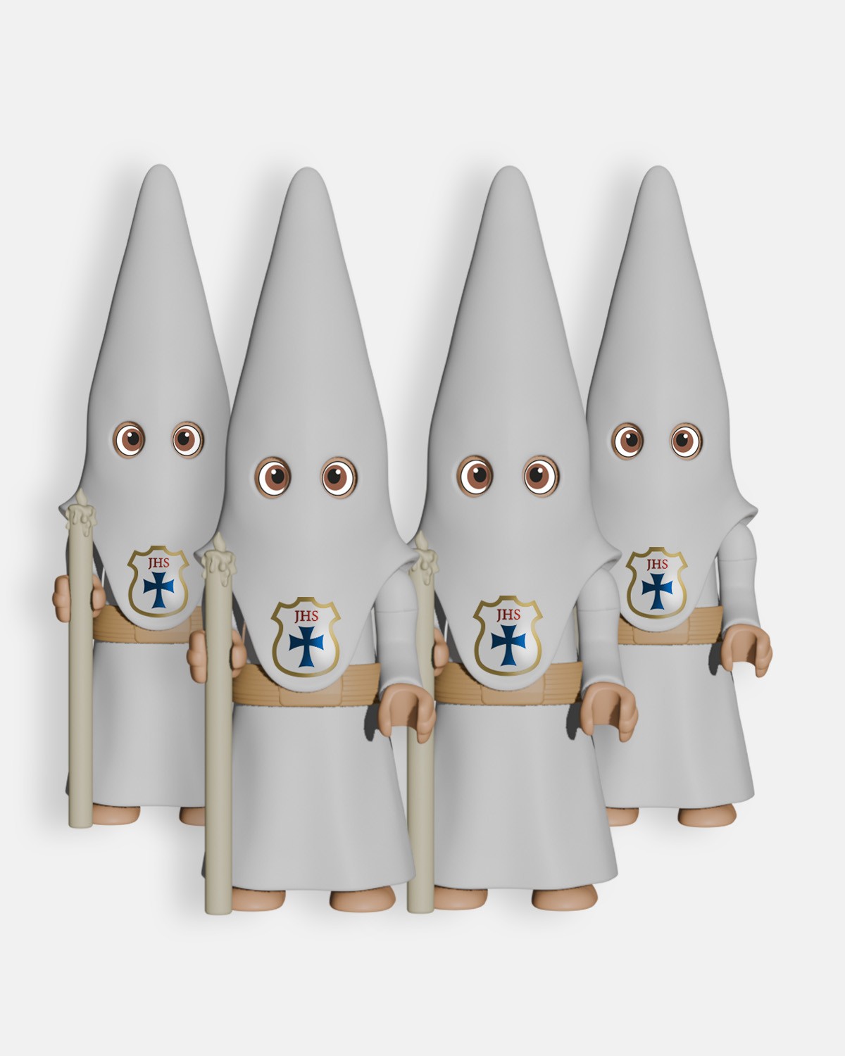 El Pack 4 Nazarenos Cola Blanco Cirio P6002 de Artabán Juguetes incluye cuatro nazarenos con túnica de cola blanca y antifaz blanco, portando cada uno un cirio, utilizado durante los desfiles procesionales de Semana Santa para iluminar y marcar el ritmo de la marcha. Al ser nazarenos de cola, no llevan capa ni cíngulo, pero sí llevan cinturón de esparto. Fabricado con materiales resistentes y seguros, es ideal para coleccionistas y aficionados a la Semana Santa, permitiendo completar secciones de los tramos procesionales de manera realista.