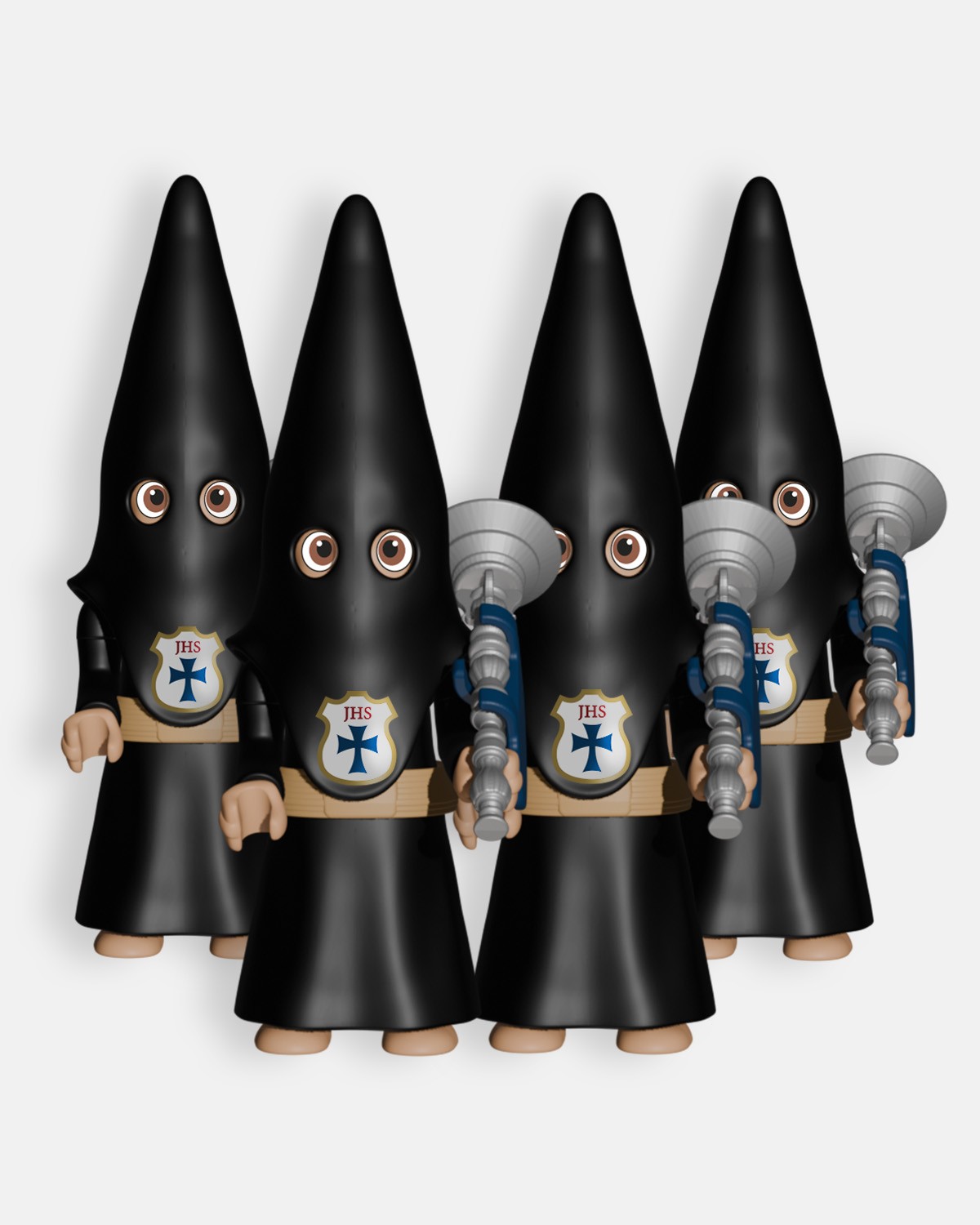 El Pack 4 Nazarenos Cola Negro Bocinas B4004 de Artabán Juguetes incluye cuatro nazarenos con túnica de cola morada, antifaz negro y cinturón de esparto, portando cada uno una bocina, una insignia formada por trompeta de plata y paño bordado, utilizada para indicar el comienzo de la cofradía o la llegada de los pasos durante los desfiles procesionales de Semana Santa. Al ser nazarenos de cola, no llevan capa ni cíngulo. Fabricado con materiales resistentes y seguros, es ideal para coleccionistas y aficionados a la Semana Santa, permitiendo completar secciones de los tramos procesionales de manera realista.