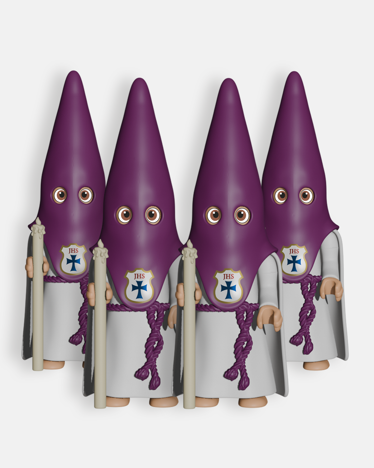 El Pack 4 Nazarenos Morado con Cirio P2002 de Artabán Juguetes incluye cuatro figuras de nazarenos con túnica y capa blancas, antifaz y cíngulo morado, portando cirios, utilizados en las procesiones de Semana Santa para iluminar y acompañar los pasos. Fabricadas con materiales resistentes y diseño detallado, estas figuras reproducen fielmente la postura, expresión y vestimenta de los nazarenos, aportando autenticidad y realismo a cualquier colección. Ideal para aficionados y coleccionistas, permite complementar tramos procesionales o recrear escenas de la Semana Santa.