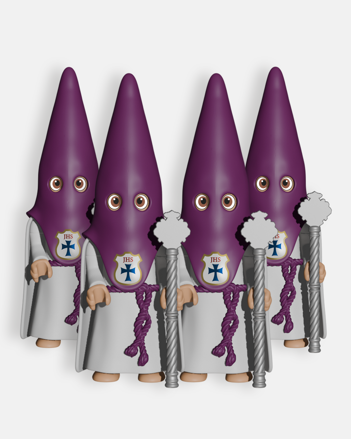 El Pack 4 Nazarenos Morado con Vara Larga Plateada P2003 de Artabán Juguetes incluye cuatro figuras de nazarenos con túnica y capa blancas, antifaz y cíngulo morado, portando varas largas plateadas, accesorios utilizados para acompañar insignias o pasos en las procesiones de Semana Santa. Fabricadas con materiales resistentes y diseño detallado, estas figuras reproducen fielmente la postura, expresión y vestimenta de los nazarenos, aportando autenticidad y realismo a cualquier colección. Ideal para aficionados y coleccionistas, permite complementar tramos procesionales o recrear escenas de la Semana Santa.