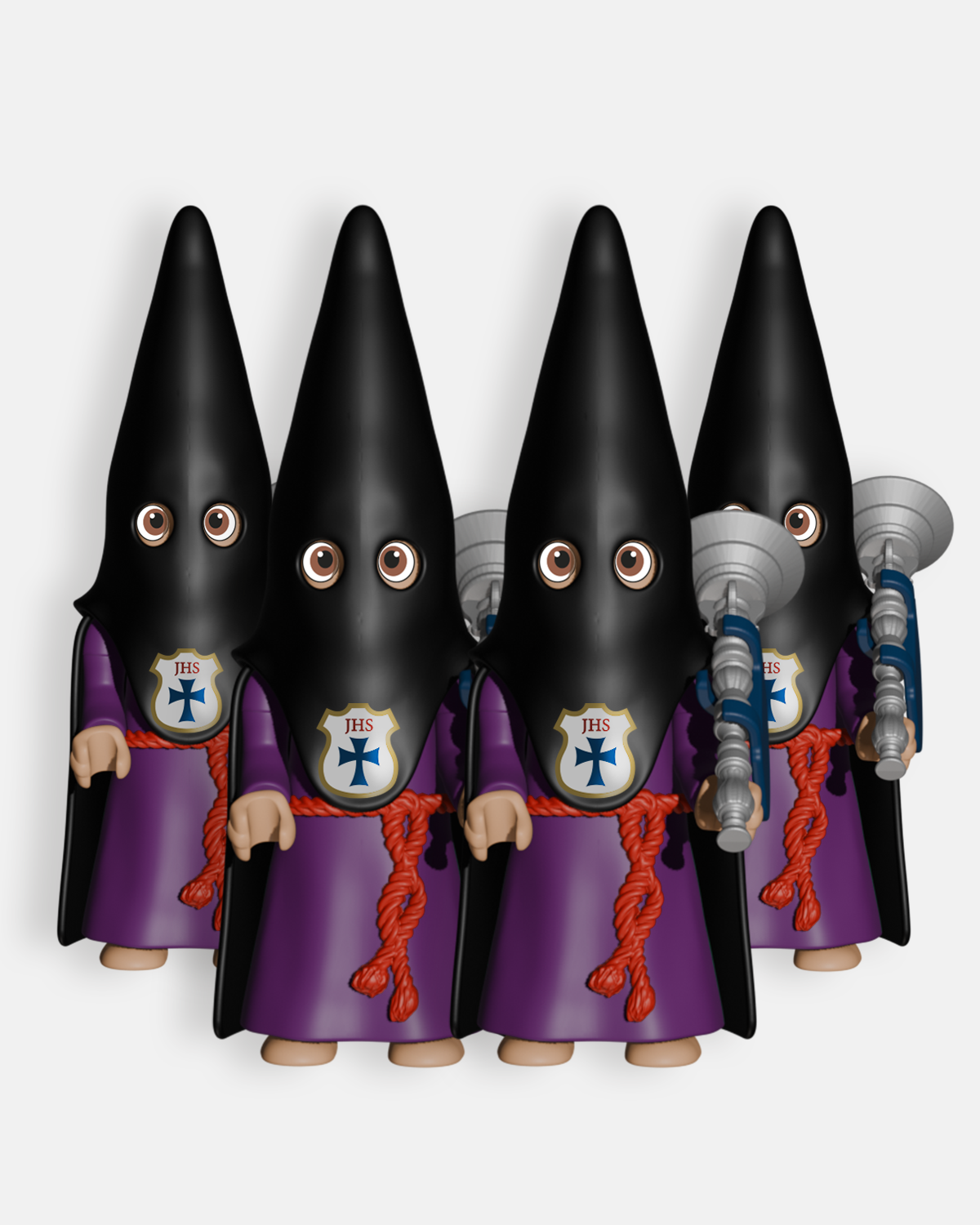 El Pack 4 Nazarenos Negro con Bocinas P3004 de Artabán Juguetes incluye cuatro figuras de nazarenos con túnica morada, capa negra, antifaz negro y cíngulo morado, portando bocinas, instrumentos formados por trompeta de plata y paño bordado, utilizados en las procesiones de Semana Santa para anunciar el comienzo de la cofradía o la llegada de los pasos. Fabricadas con materiales resistentes y diseño detallado, estas figuras reproducen fielmente la postura, expresión y vestimenta de los nazarenos, aportando autenticidad y realismo a cualquier colección.