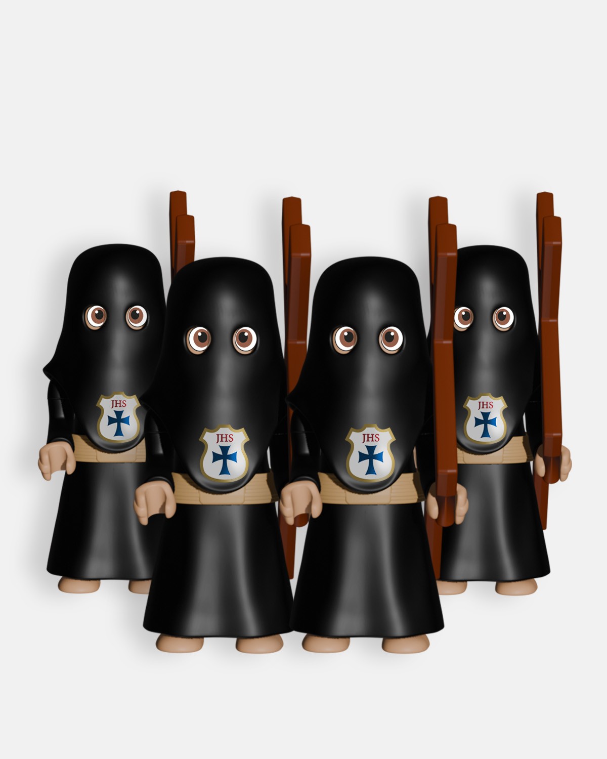 El Pack 4 Penitentes Cola Negro Cruz de Penitencia P4005 de Artabán Juguetes incluye cuatro penitentes con túnica de cola negra, antifaz negro y cinturón de esparto, portando cada uno una cruz de penitencia, utilizada durante los desfiles procesionales de Semana Santa para acompañar los pasos o marcar los tramos del cortejo. Al ser penitentes de cola, no llevan capa ni cíngulo. Fabricado con materiales resistentes y seguros, es ideal para coleccionistas y aficionados a la Semana Santa, permitiendo representar secciones completas del cortejo de manera realista.