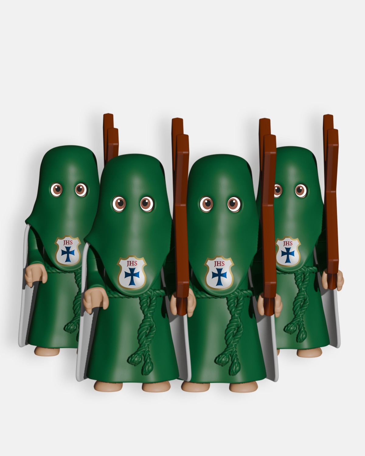 El Pack 4 Penitentes Verde Cruz P0005 de Artabán Juguetes incluye cuatro penitentes con túnica verde, capa blanca, antifaz y cíngulo verdes, portando cada uno una cruz, utilizada durante los desfiles procesionales de Semana Santa para acompañar los pasos o marcar los tramos del cortejo. Al ser penitentes, no llevan capirote. Fabricado con materiales resistentes y seguros, es ideal para coleccionistas y aficionados a la Semana Santa, permitiendo representar secciones completas del cortejo de manera realista.