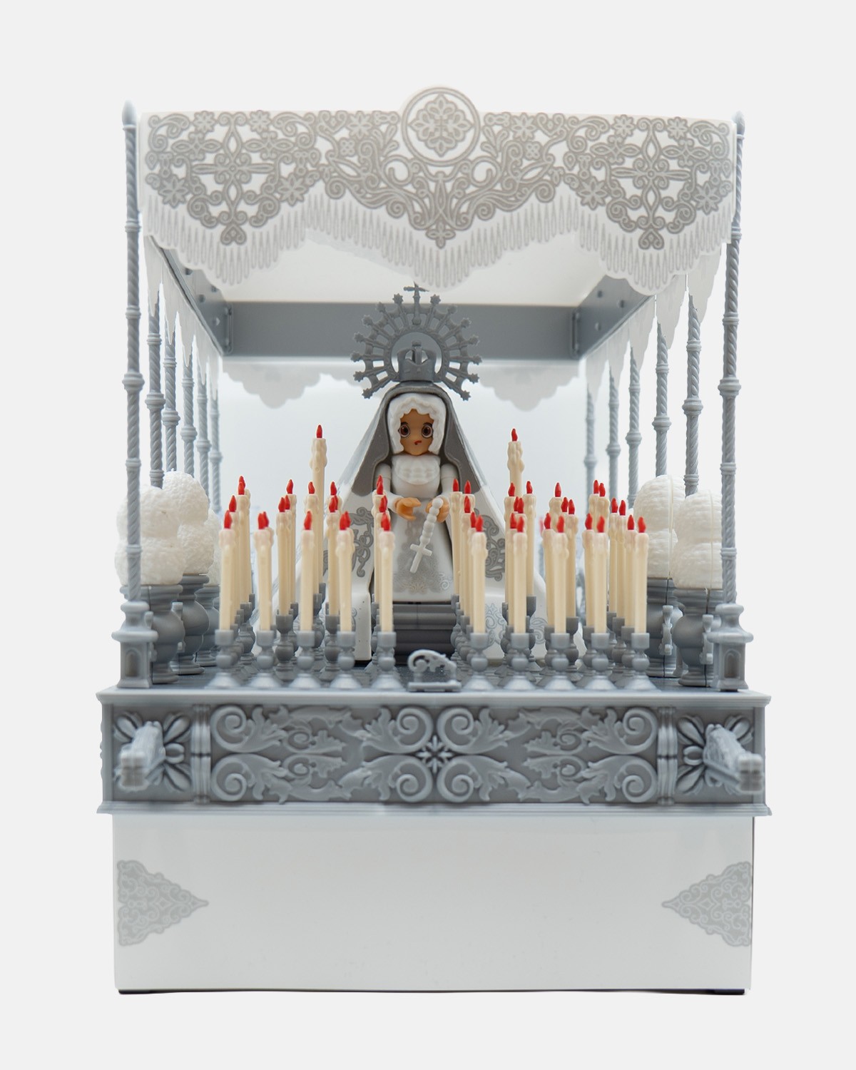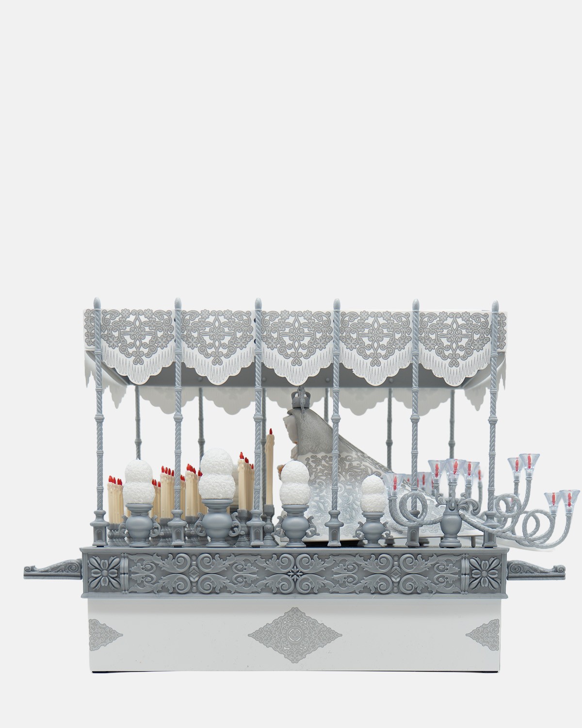 9El Paso de Palio Blanco P9025 incluye varales, bambalinas blancas, jarras con claveles, candelería plateada, candelabros de cola y la Virgen coronada. Tradición Artabán.