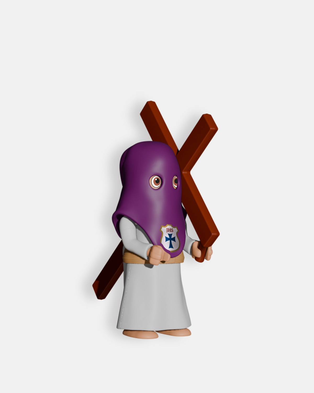 Fabricado con materiales duraderos, este modelo refleja con precisión los elementos típicos de los penitentes morados de cola, incluyendo la túnica de cola morada, antifaz morado y cinturón de esparto, y las cruces, diseñado para evocar los desfiles procesionales de manera fiel y elegante.